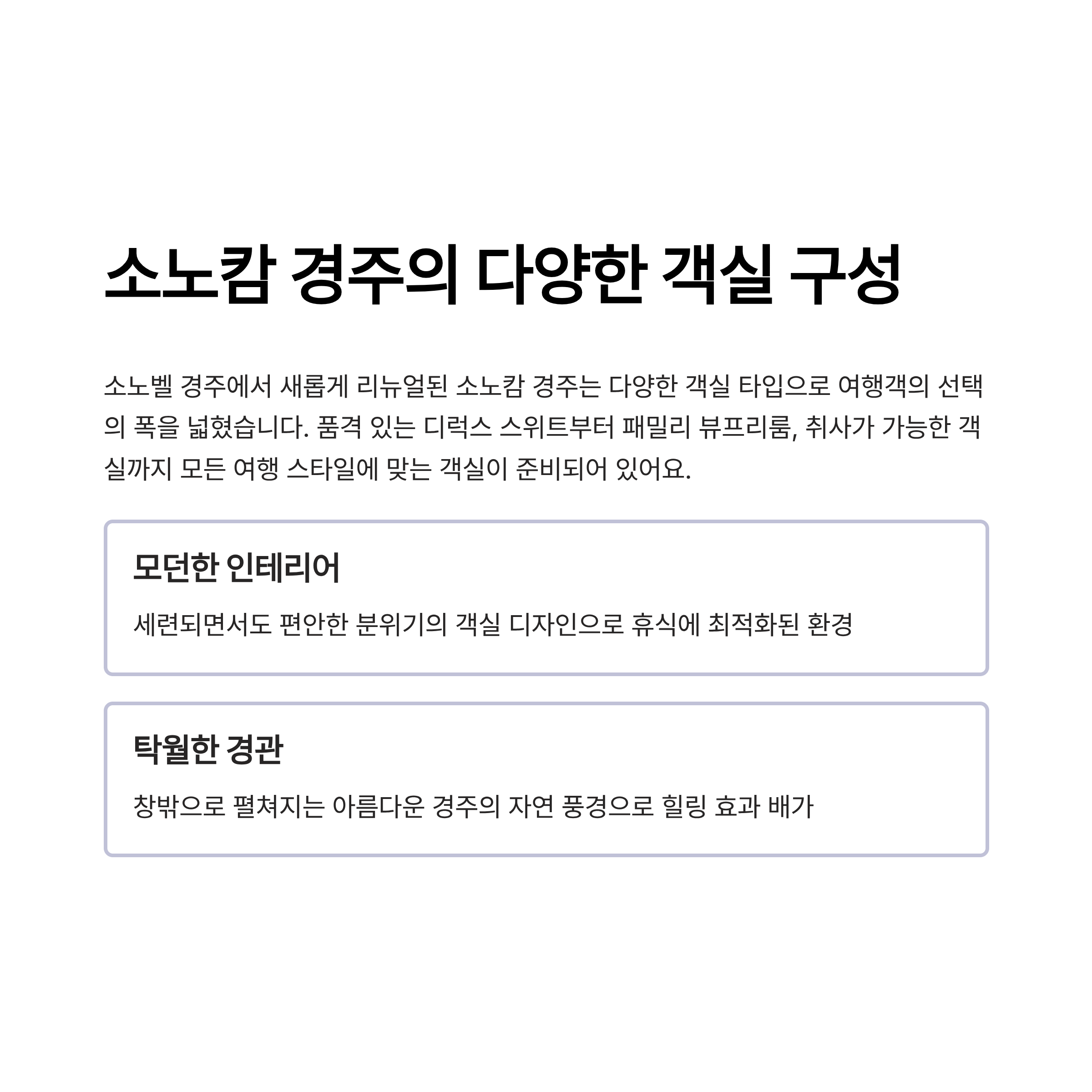 소노벨 경주에서 새롭게 리뉴얼되어 품격 있는 디럭스 스위트부터 패밀리 뷰프리룸, 취사가 가능한 객실까지 선택 폭이 넓습니다. 모던하면서도 편안한 분위기의 인테리어가 특징이며, 창밖 경관도 탁월해 힐링에 제격입니다.