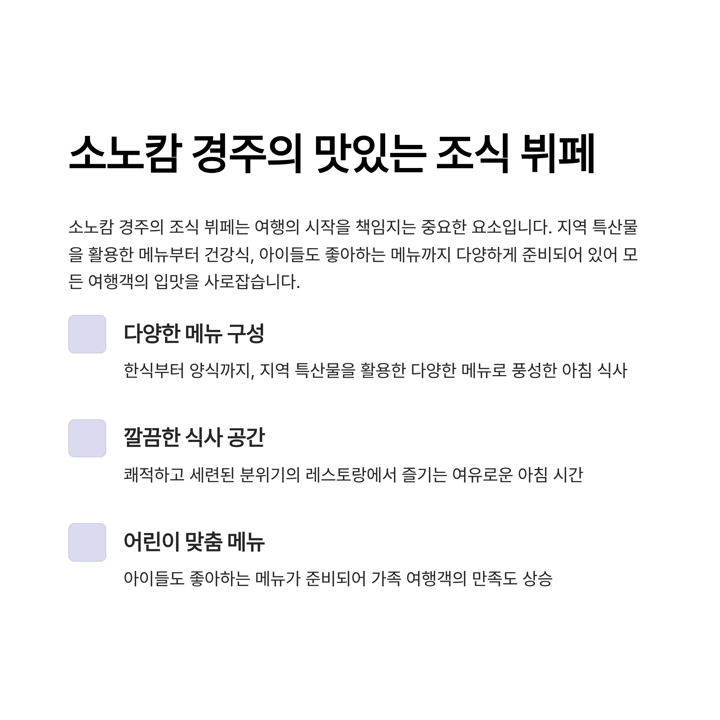 조식은 지역 특산물을 활용한 메뉴부터 건강식, 아이들도 좋아하는 메뉴까지 다양해 호평을 받고 있습니다. 깔끔한 공간과 정성 가득한 음식 덕분에 여행의 좋은 시작을 책임집니다.