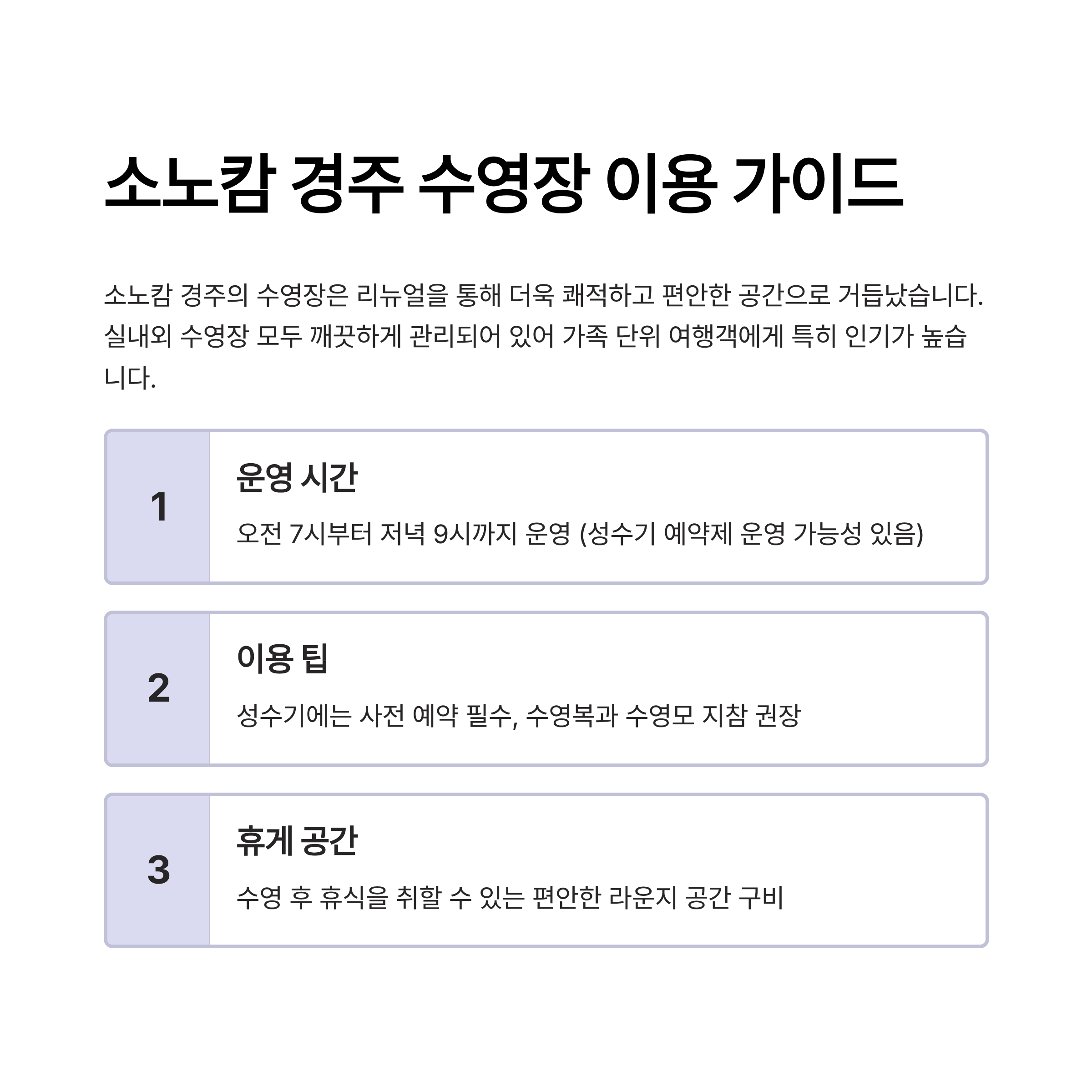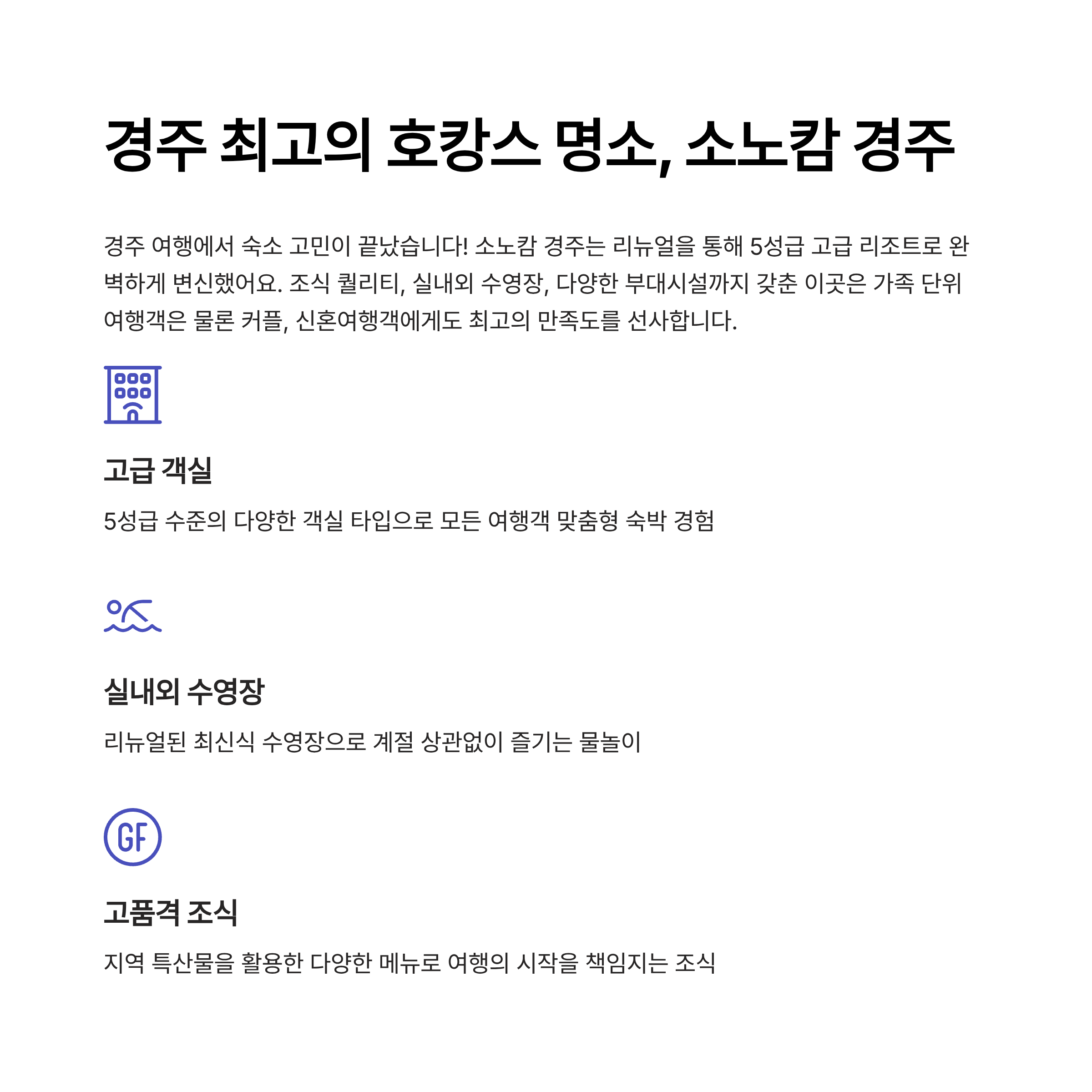 경주 여행에서 호텔 숙소 고르기 고민되시죠? 소노캄 경주는 리뉴얼을 거쳐 5성급 고급 리조트로 변신해 호캉스에 최적화된 환경을 제공합니다. 조식 퀄리티, 실내외 수영장, 다양한 부대시설까지 가족 단위 여행객은 물론 커플, 신혼여행객에게도 만족도가 높아요. 이번 글에서는 소노캄 경주 최신 시설과 숙소 종류, 리조트 내 즐길거리까지 자세히 알려드릴게요.