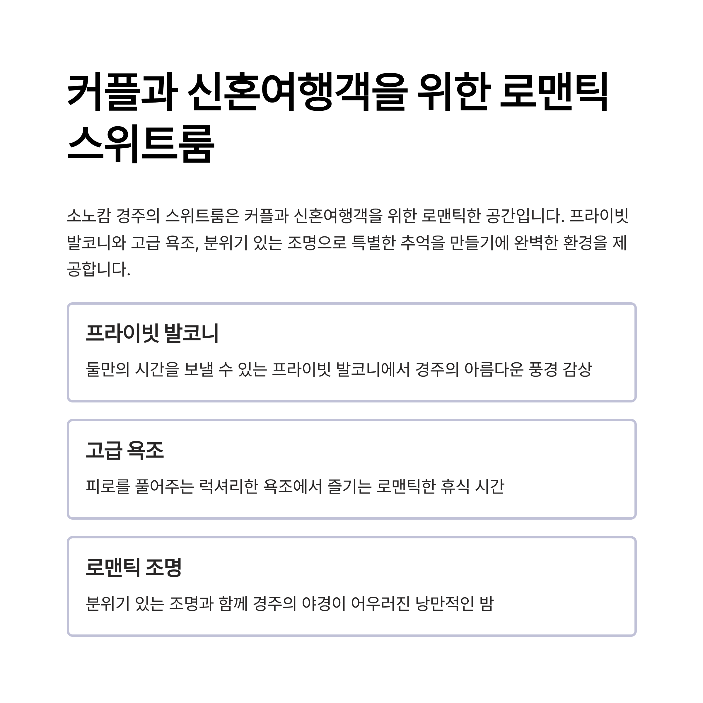 프라이빗 발코니와 고급 욕조, 분위기 있는 조명으로 낭만적인 시간을 보내기에 적합합니다. 특히 밤에는 조명과 어우러진 경주의 야경이 로맨틱함을 더합니다.