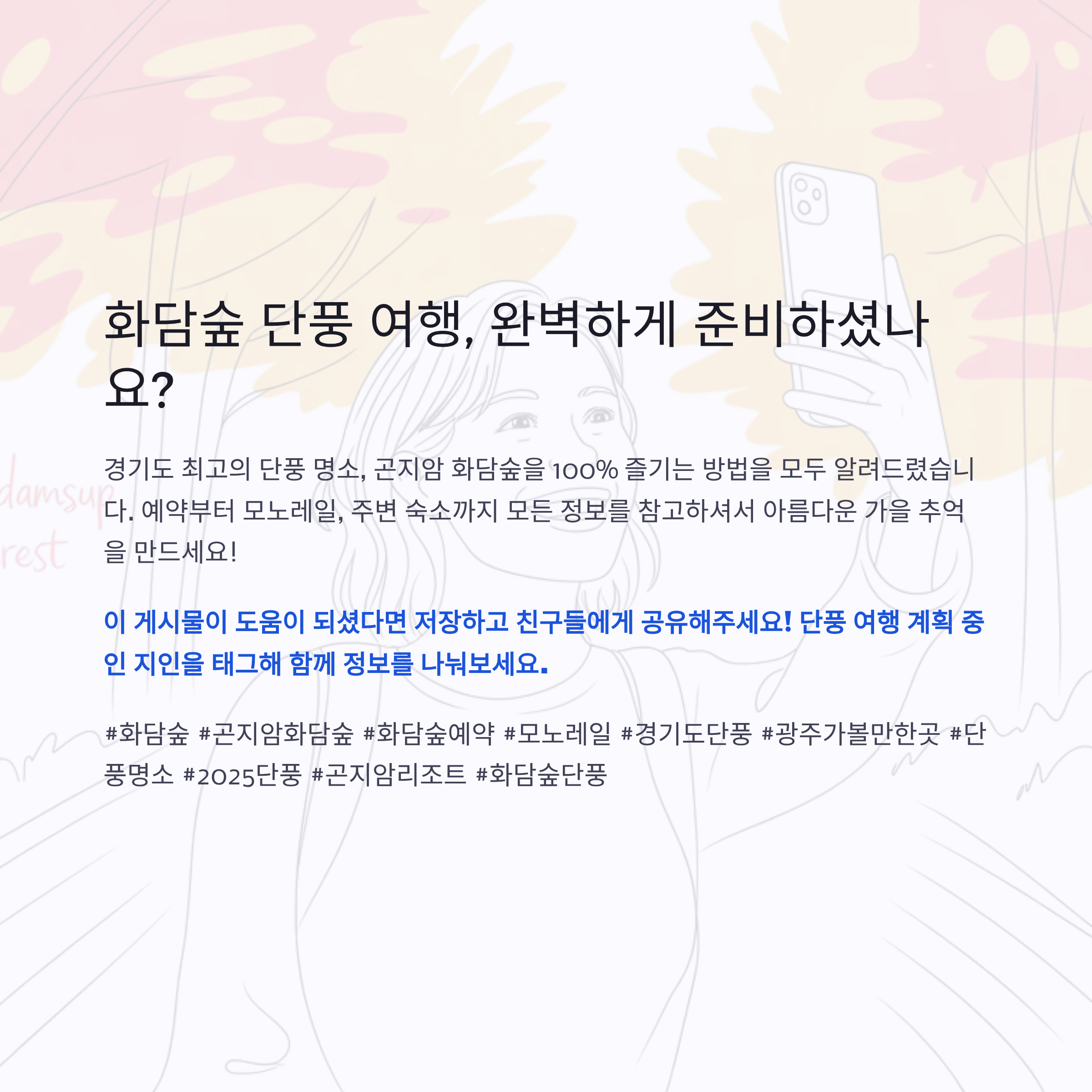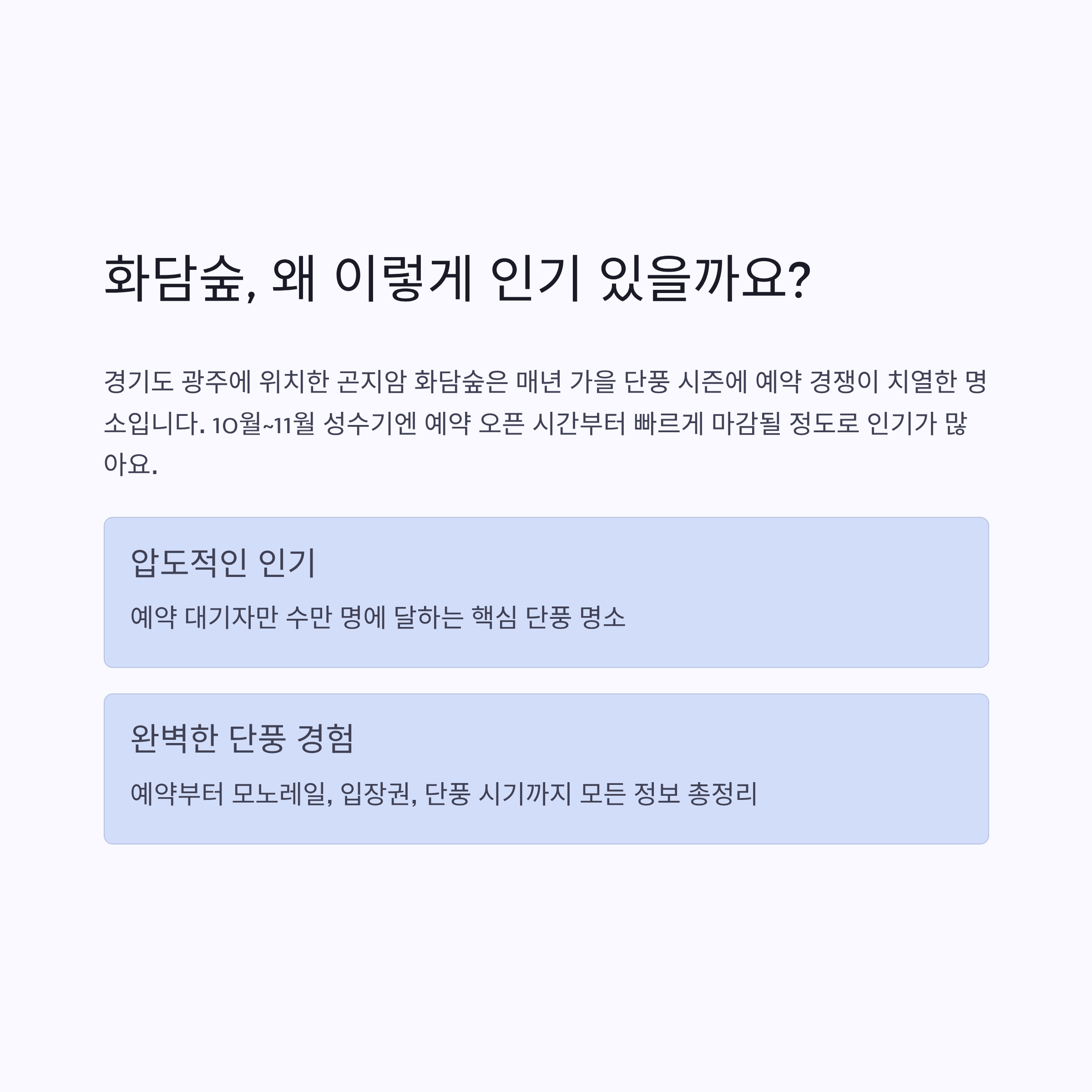 경기도 광주에 위치한 곤지암 화담숲은 매년 가을 단풍 시즌에 예약 경쟁이 치열한 명소입니다. 10월~11월 성수기엔 예약 오픈 시간부터 빠르게 마감될 정도로 인기가 많아요. 예약 방법, 모노레일 이용 팁, 입장권 가격, 단풍 시기 등 꼭 알아야 할 핵심 정보만 쏙쏙 정리해 안내드립니다. 본문에서 꿀팁까지 모두 소개하니 화담숲 단풍 명소 제대로 즐겨보세요.