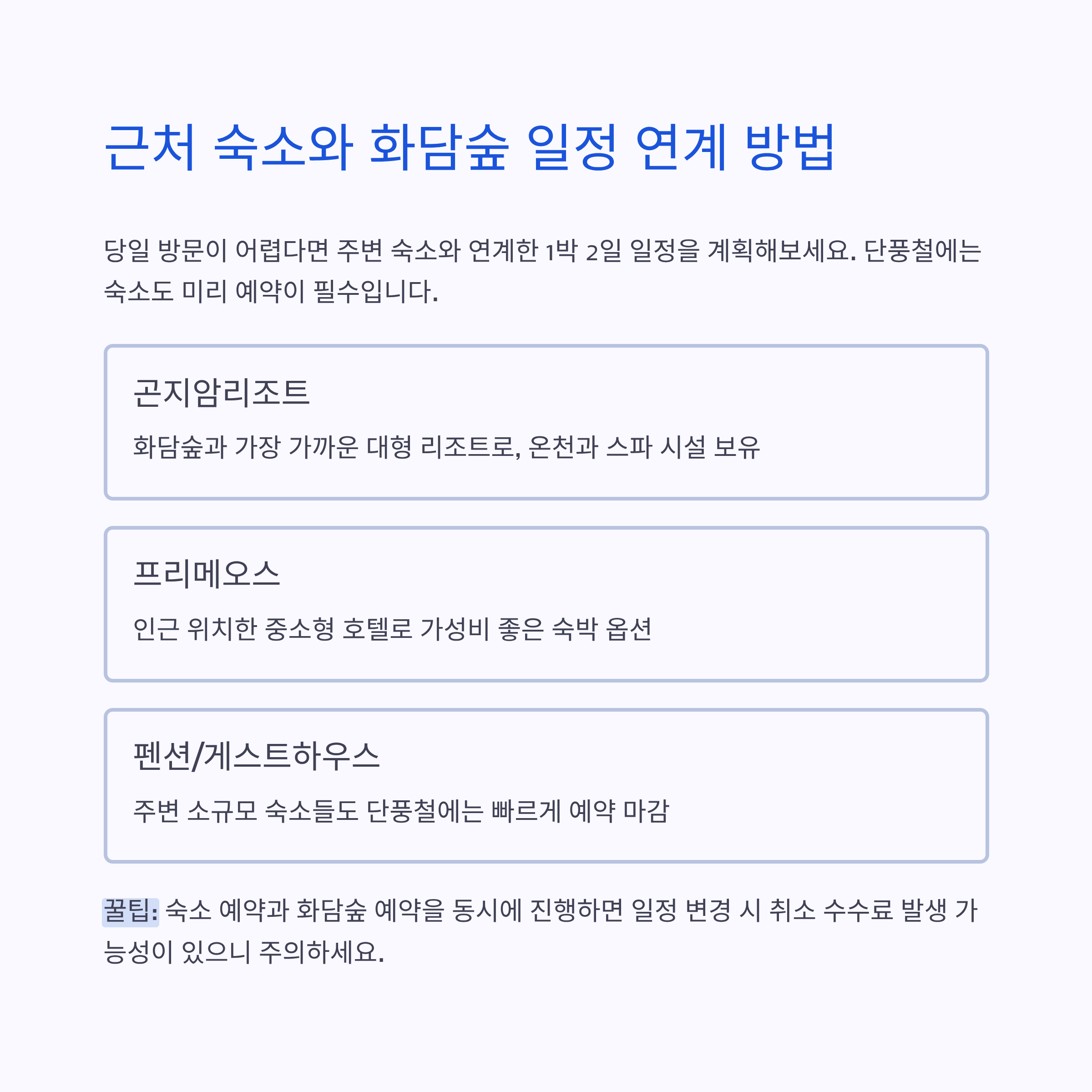 곤지암리조트, 프리메오스 등 화담숲 인근 숙소는 단풍철 극성수기에 미리 예약 필수입니다. 당일 방문이 어려운 경우 숙박과 연계한 일정도 추천됩니다.