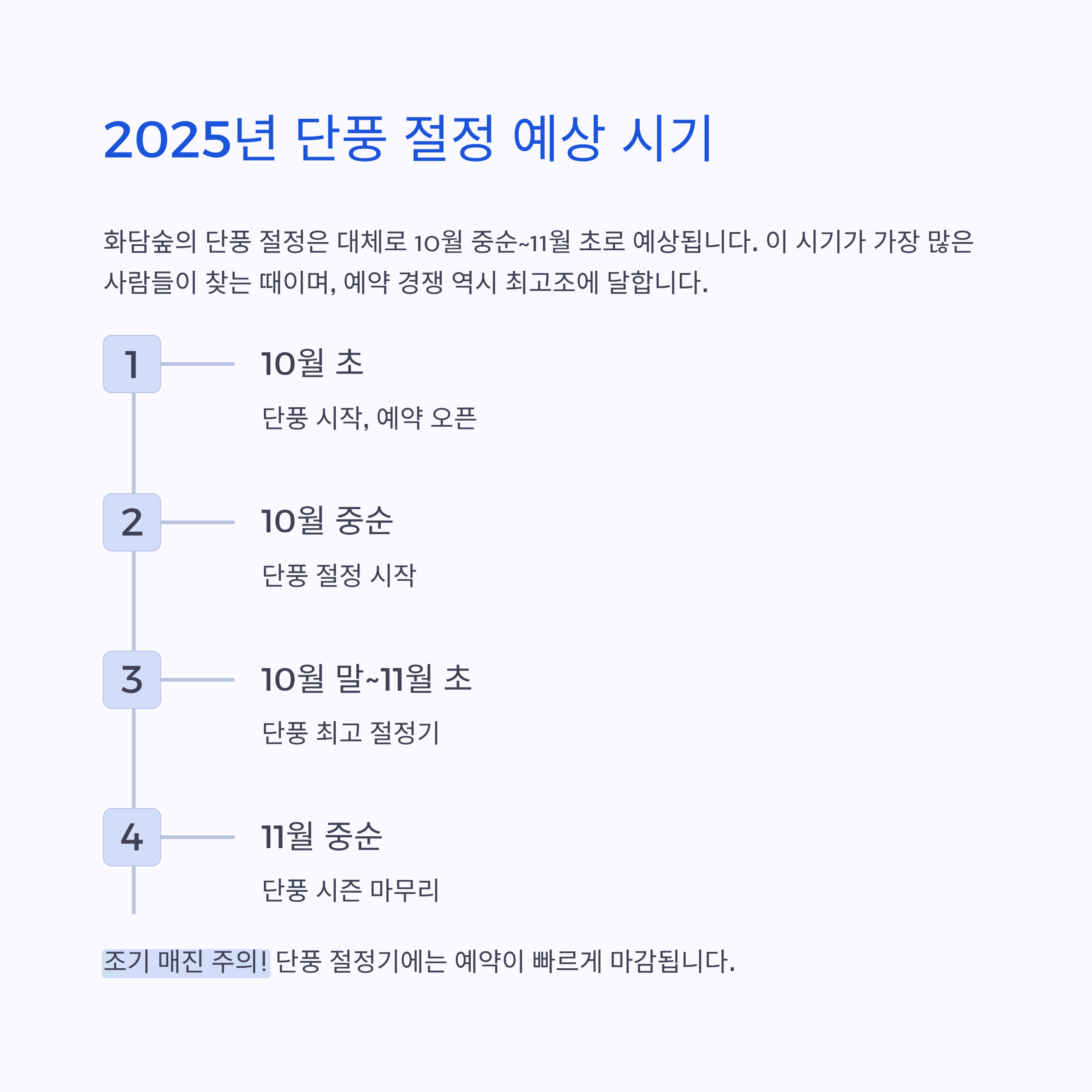 화담숲의 단풍 절정은 대체로 10월 중순~11월 초로 예상됩니다. 이 시기가 가장 많은 사람들이 찾으니 예약 경쟁 역시 최고조에 달합니다. 조기 매진 주의하세요.
