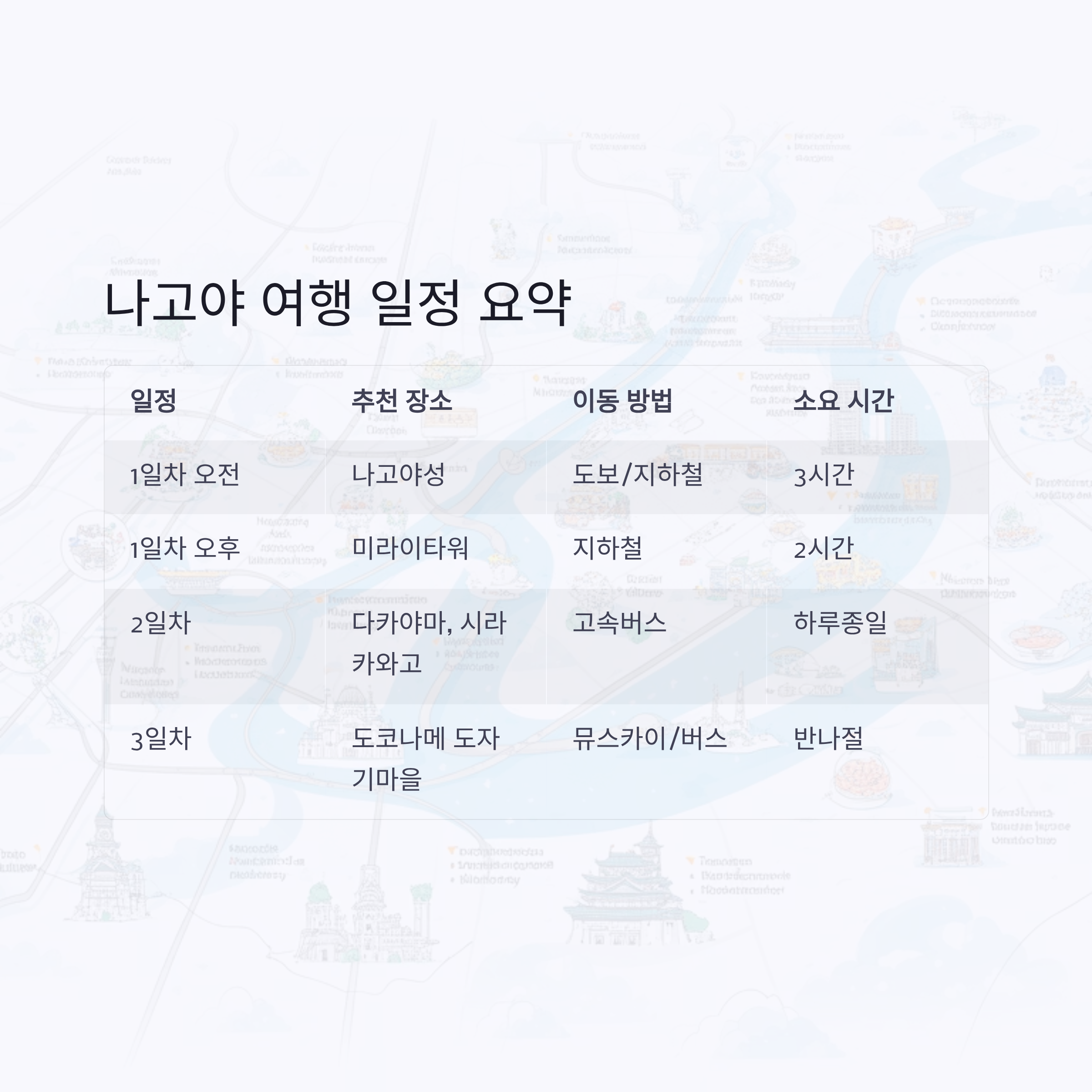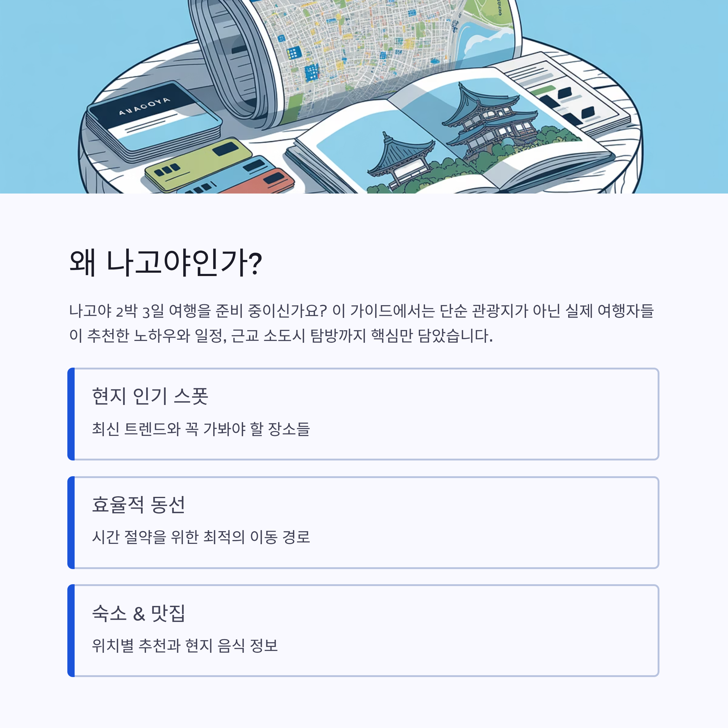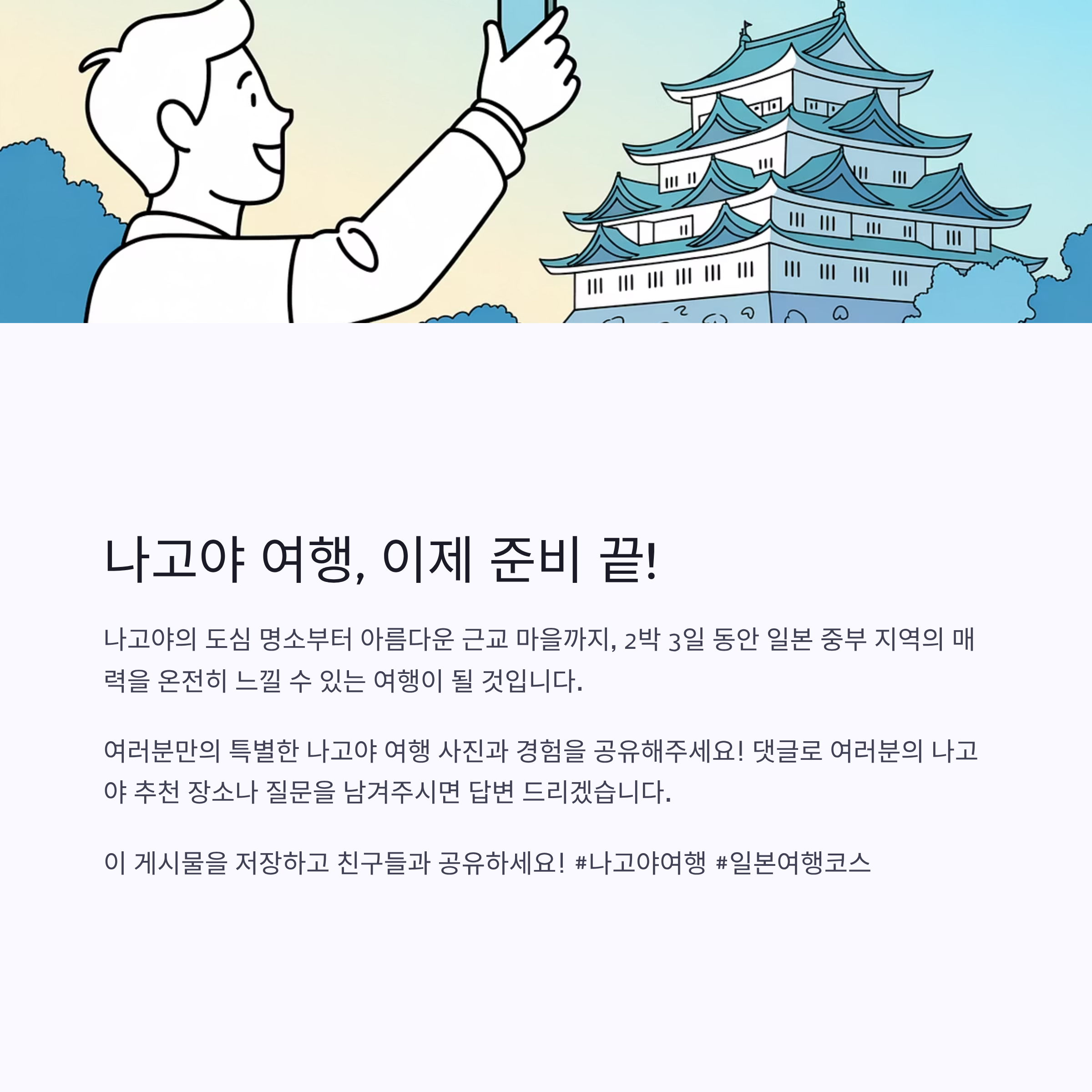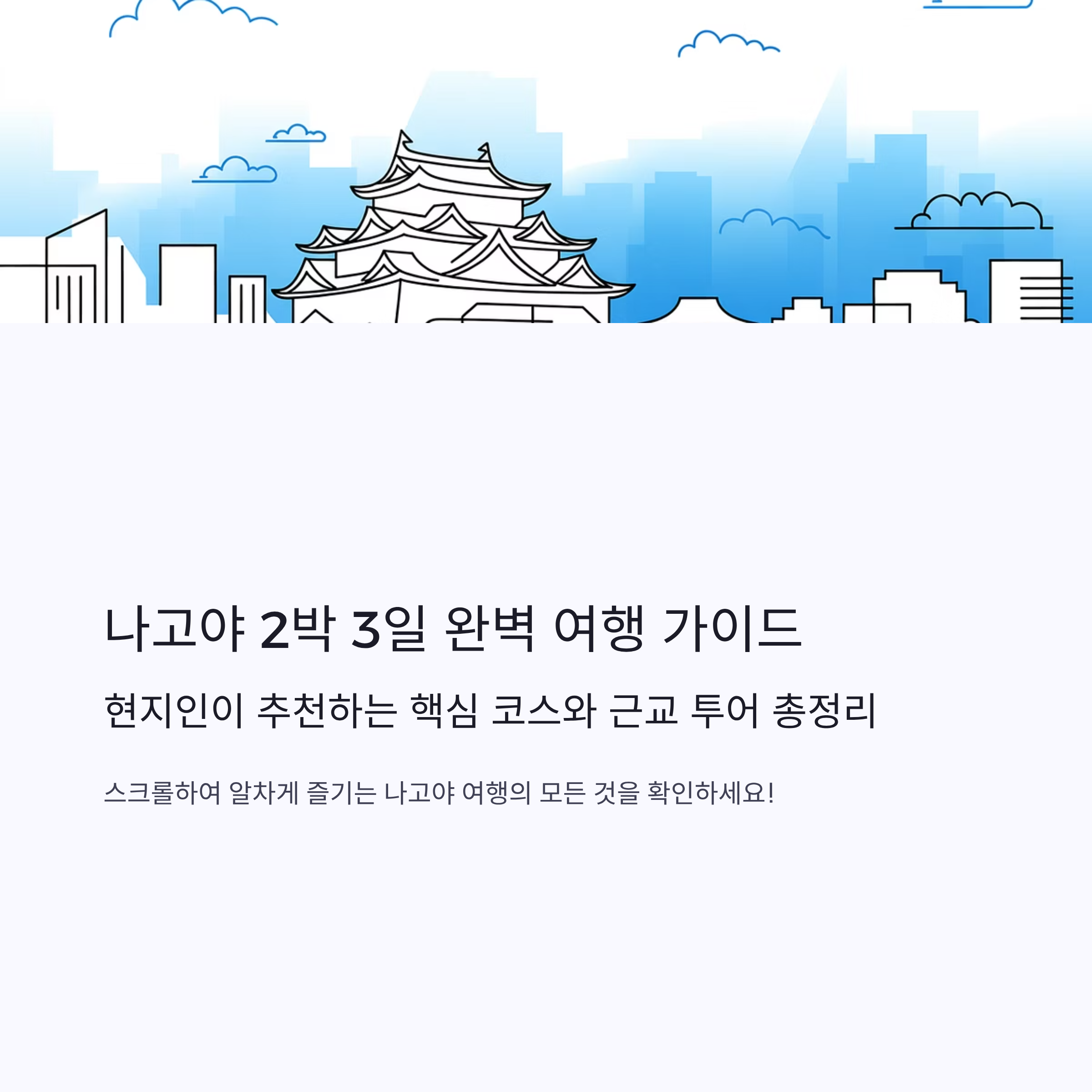 나고야 2박 3일 여행을 준비 중이신가요? 이번 글에서는 단순 관광지가 아닌 실제 여행자들이 추천한 노하우와 일정, 근교 소도시 탐방까지 핵심만 담았습니다. 최근 인기 스폿, 동선 팁, 숙소 위치, 음식, 그리고 핵심 교통 정보까지 빠짐없이 정리했으니, 이 글 하나로 나고야 여행 계획 완성하실 수 있어요.