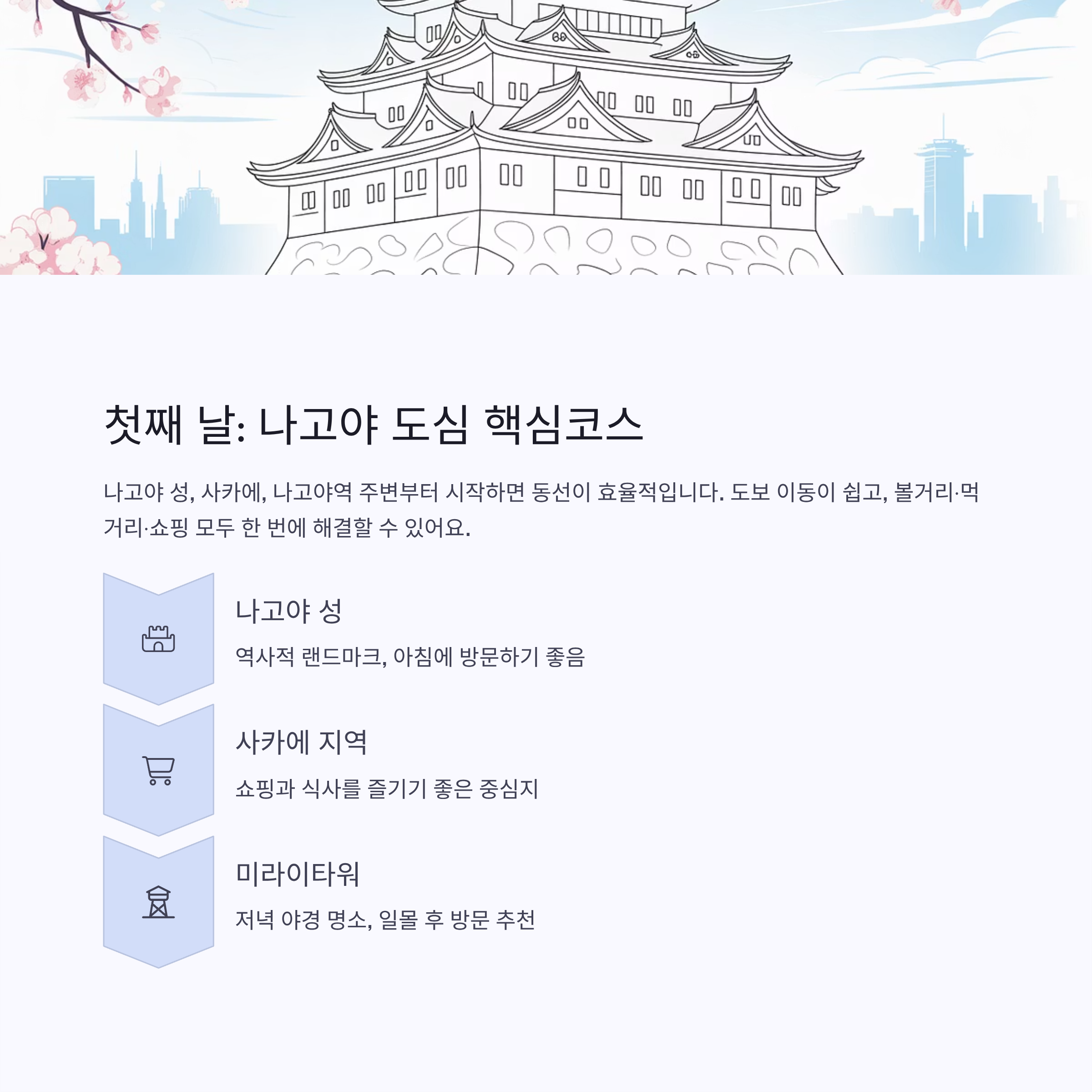 나고야 성, 사카에, 나고야역 주변부터 시작하면 동선이 효율적입니다. 도보 이동이 쉽고, 볼거리·먹거리·쇼핑 모두 한 번에 해결할 수 있어요. 미라이타워 전망대는 야경 명소로 유명하니 저녁엔 꼭 들러보시기 바랍니다.
