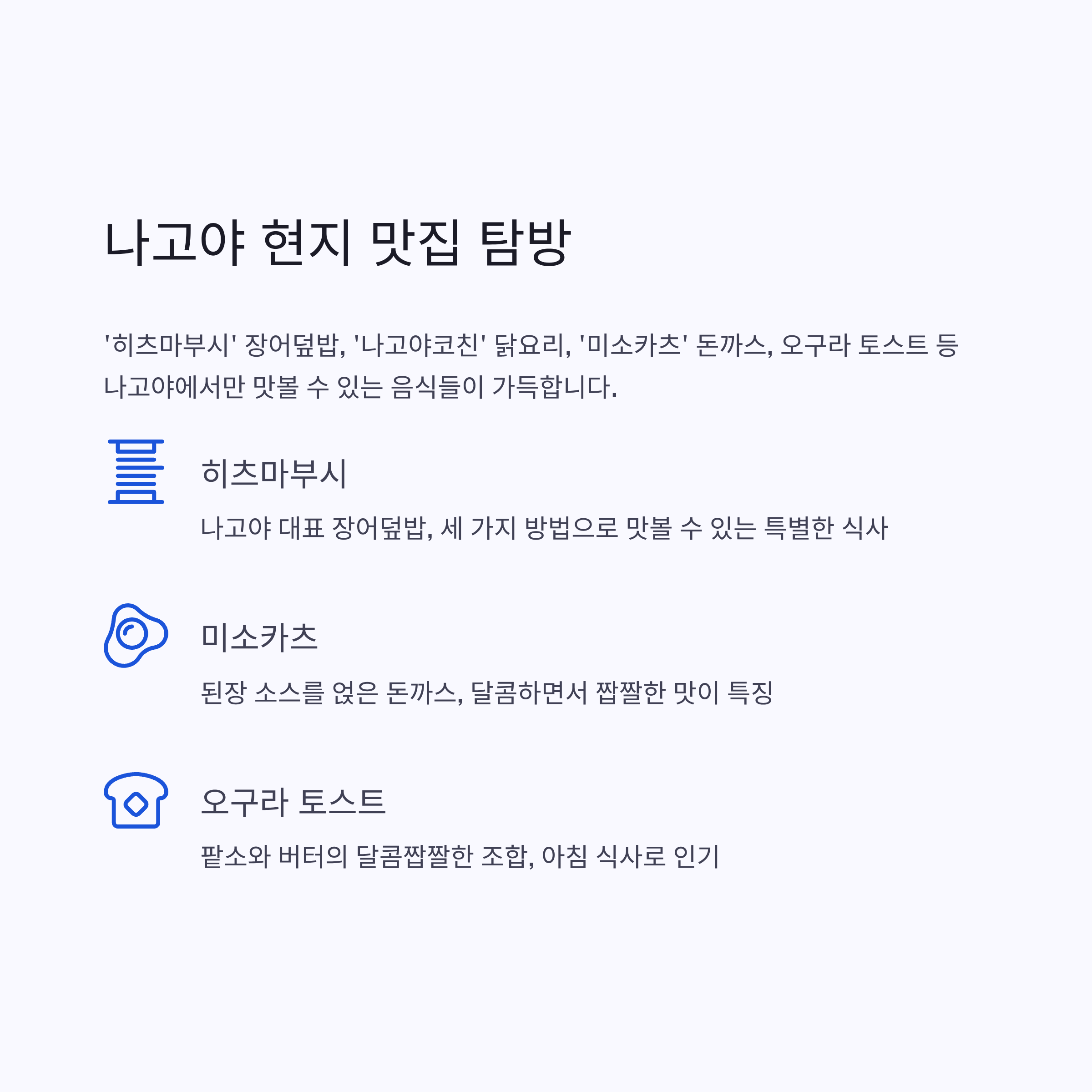 '히츠마부시' 장어덮밥, '나고야코친' 닭요리, '미소카츠' 돈까스, 오구라 토스트 등 나고야에서만 맛볼 수 있는 음식들이 가득합니다. 여행 중 하루 한 번은 꼭 지역 인기 맛집을 방문해보세요.