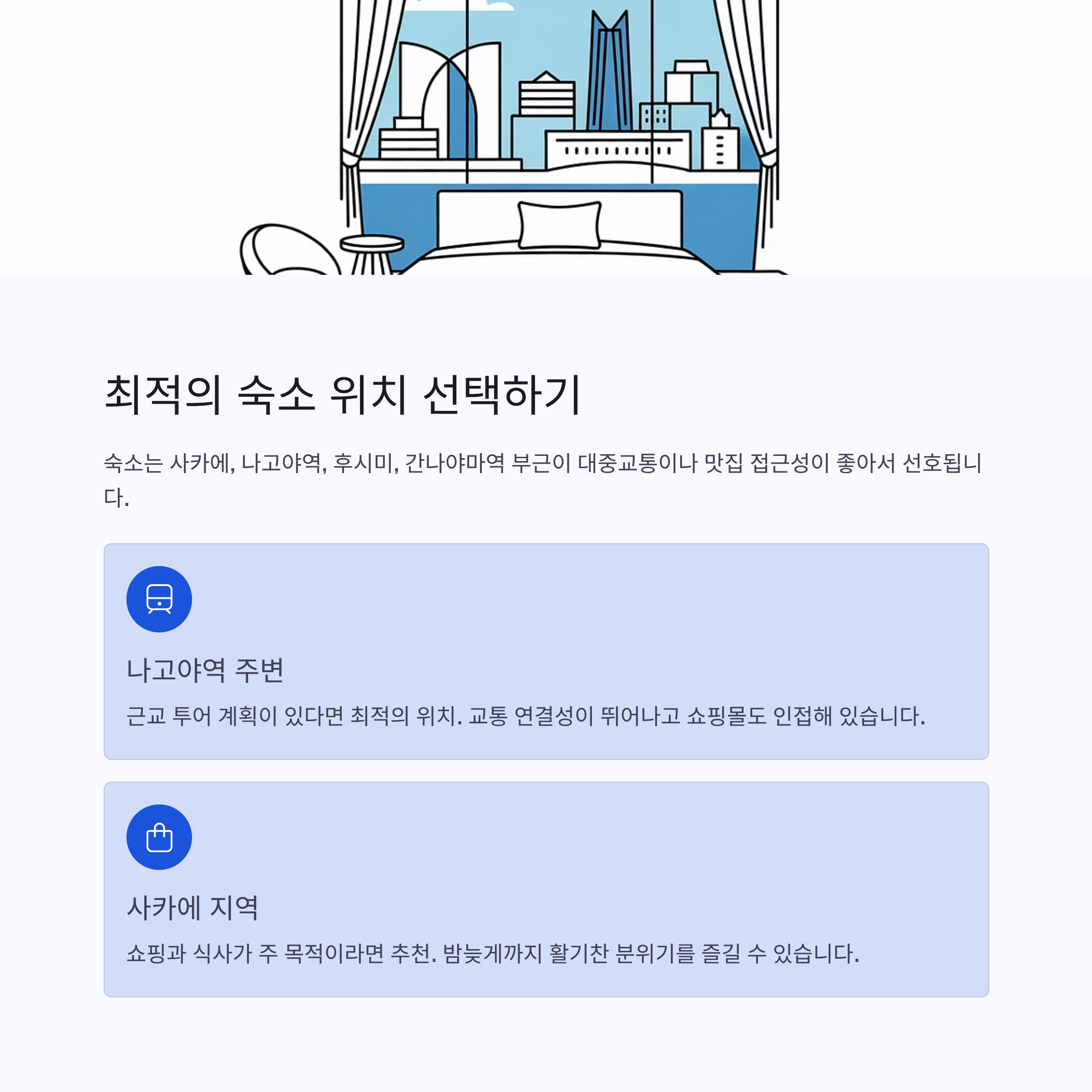 숙소는 사카에, 나고야역, 후시미, 간나야마역 부근이 대중교통이나 맛집 접근성이 좋아서 선호됩니다. 근교 투어 일정이 있다면 나고야역 인근이 이동이 편리합니다.