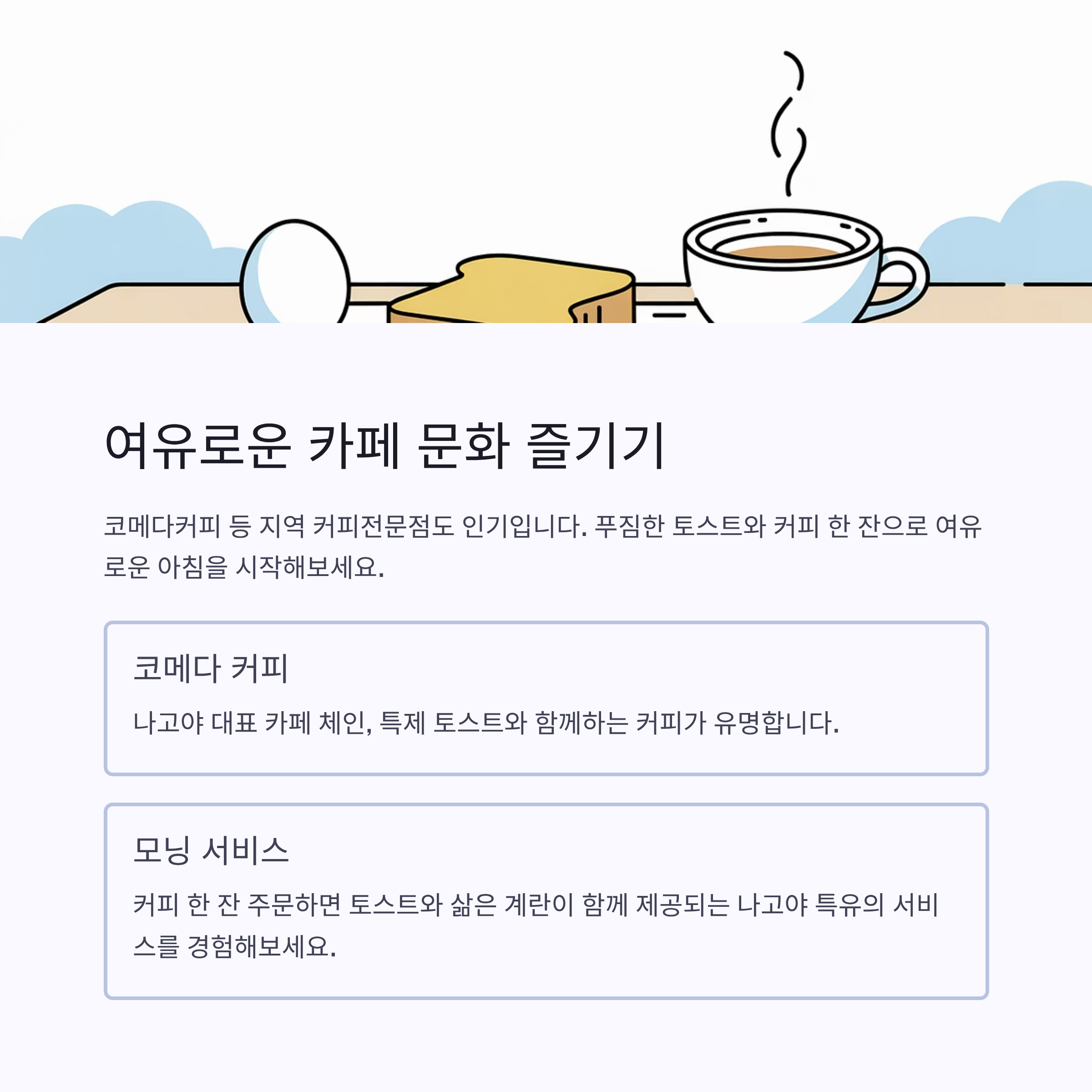 코메다커피 등 지역 커피전문점도 인기입니다. 푸짐한 토스트와 커피 한 잔으로 여유로운 아침을 시작해보세요.