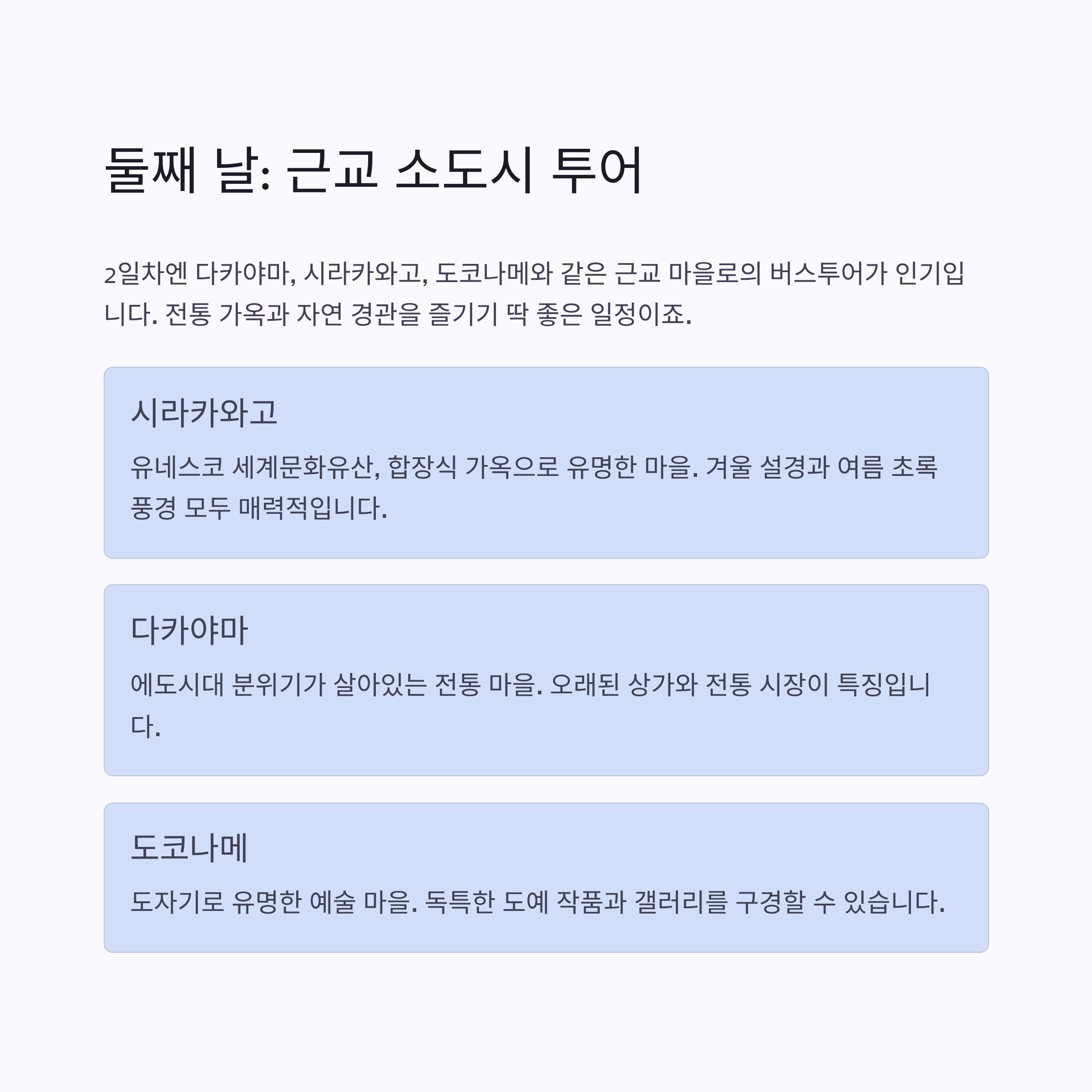 2일차엔 다카야마, 시라카와고, 도코나메와 같은 근교 마을로의 버스투어가 인기입니다. 전통 가옥과 자연 경관을 즐기기 딱 좋은 일정이죠. 시라카와고는 겨울 설경, 여름 초록풍경 모두 멋져요.