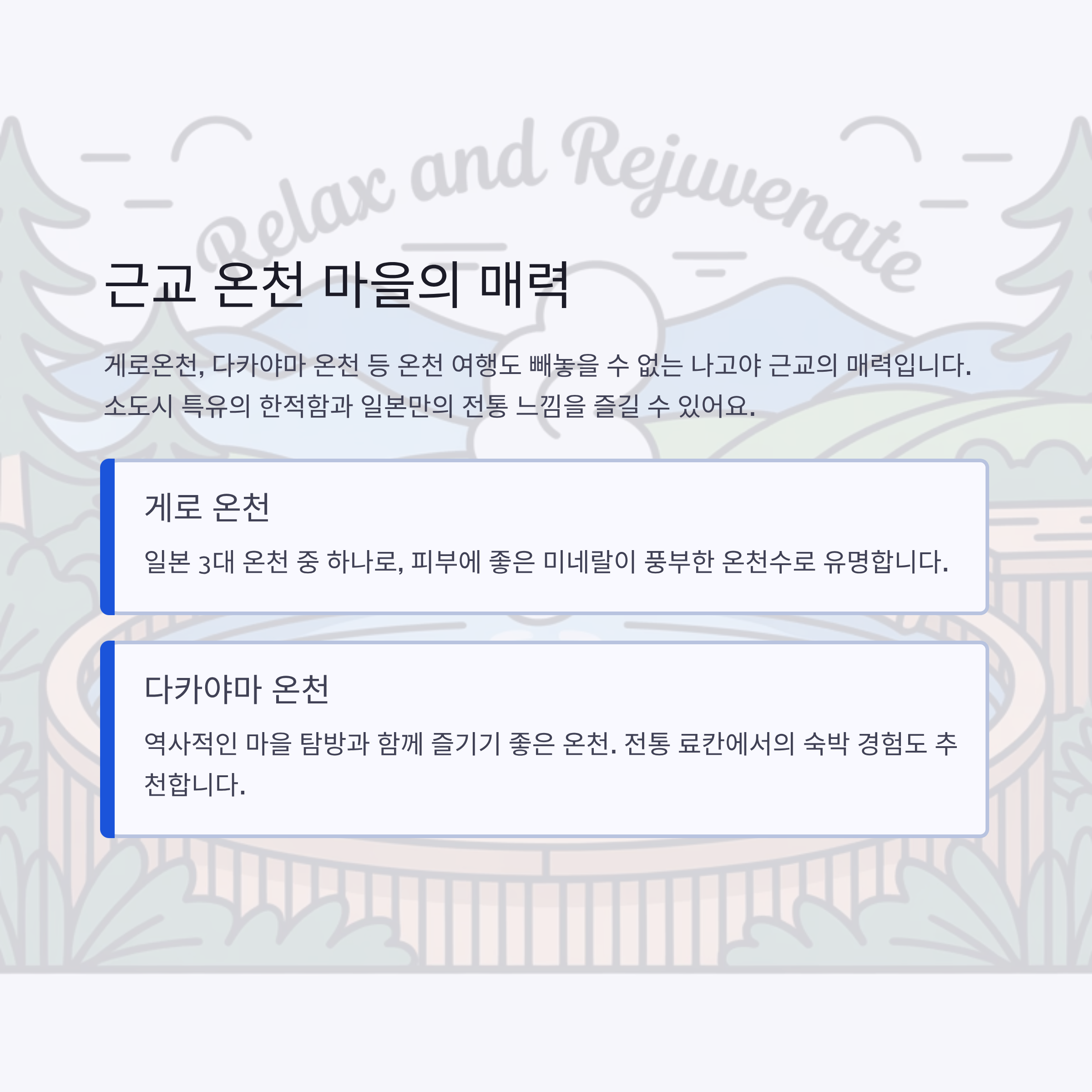 게로온천, 다카야마 온천 등 온천 여행도 빼놓을 수 없는 나고야 근교의 매력입니다. 소도시 특유의 한적함과 일본만의 전통 느낌을 즐길 수 있어요.