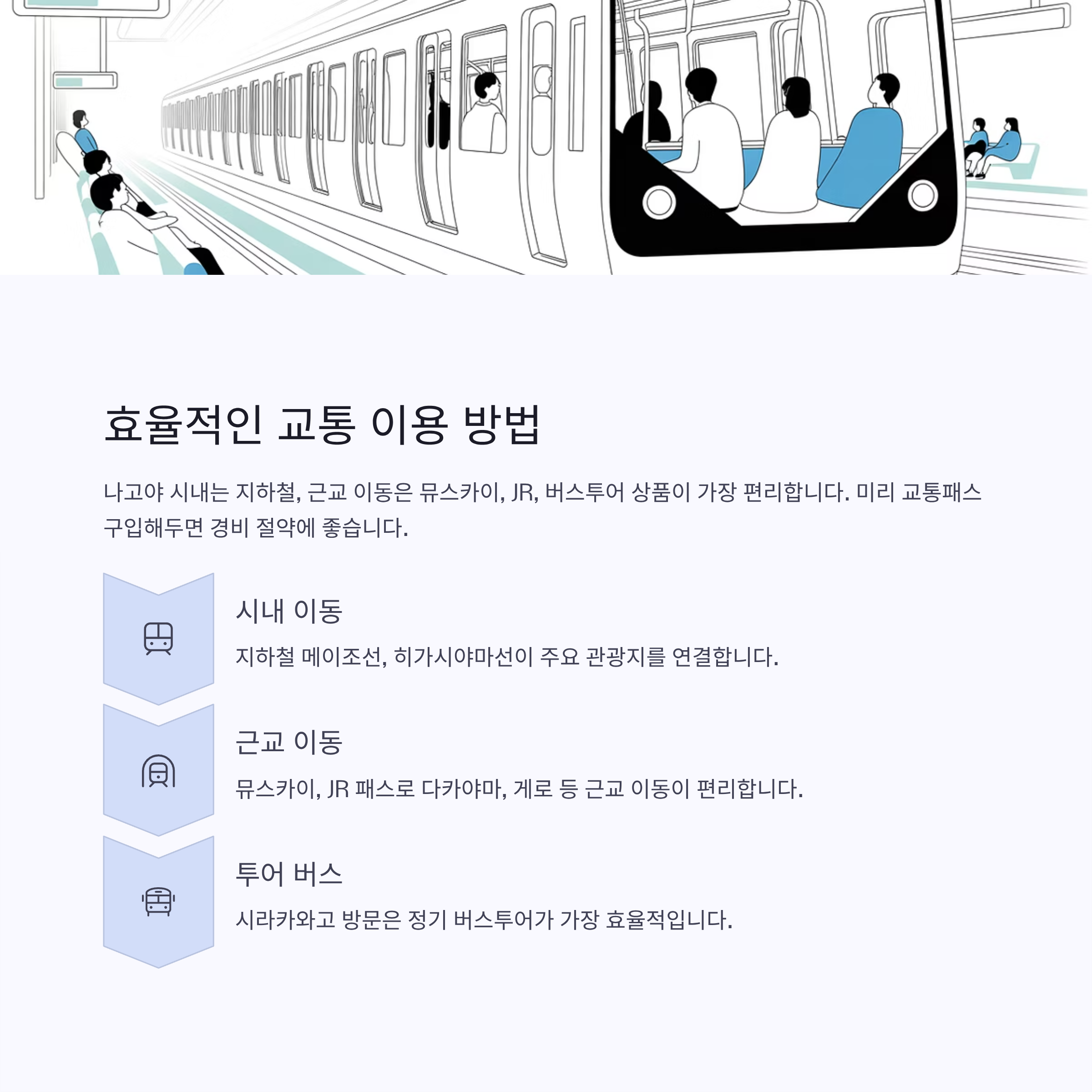 나고야 시내는 지하철, 근교 이동은 뮤스카이, JR, 버스투어 상품이 가장 편리합니다. 미리 교통패스 구입해두면 경비 절약에 좋으니, 여행 전 확인해보세요.