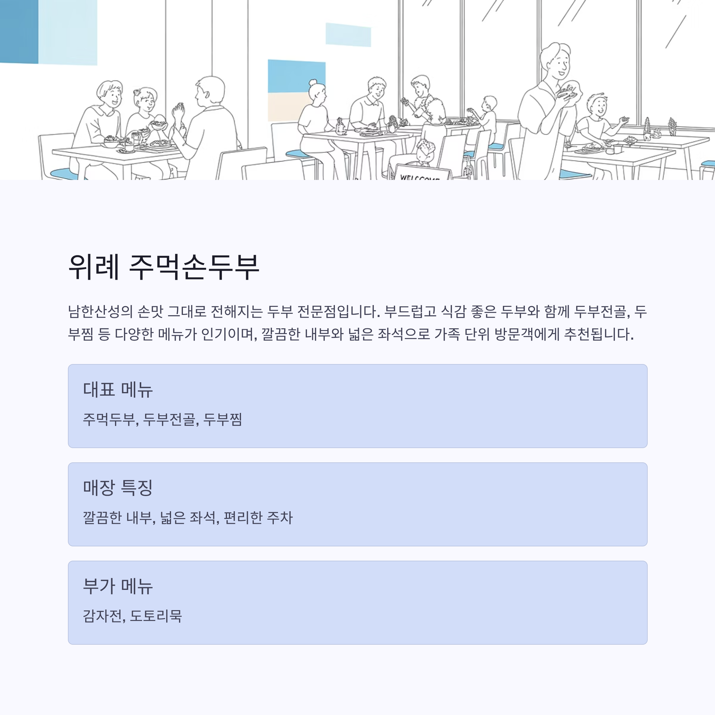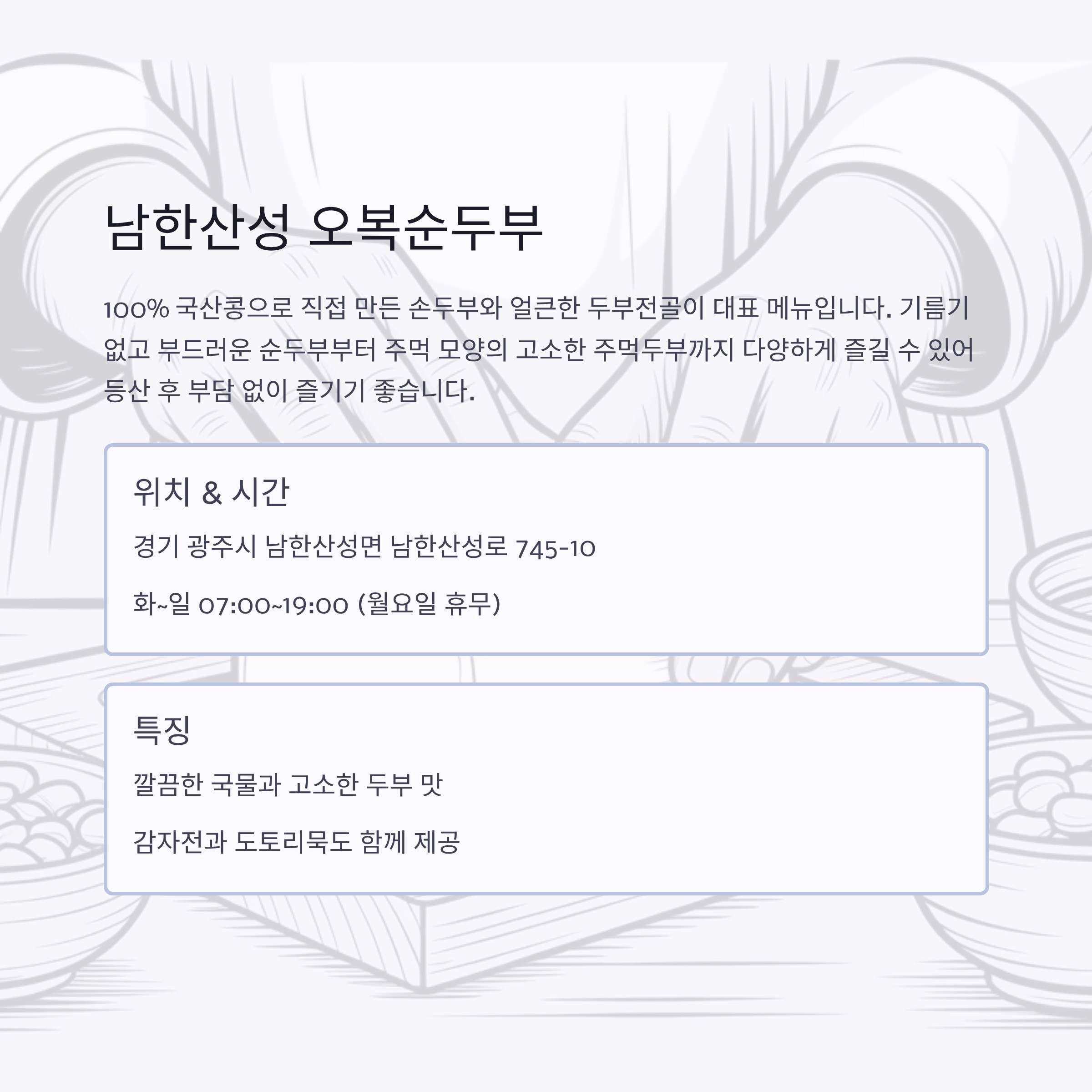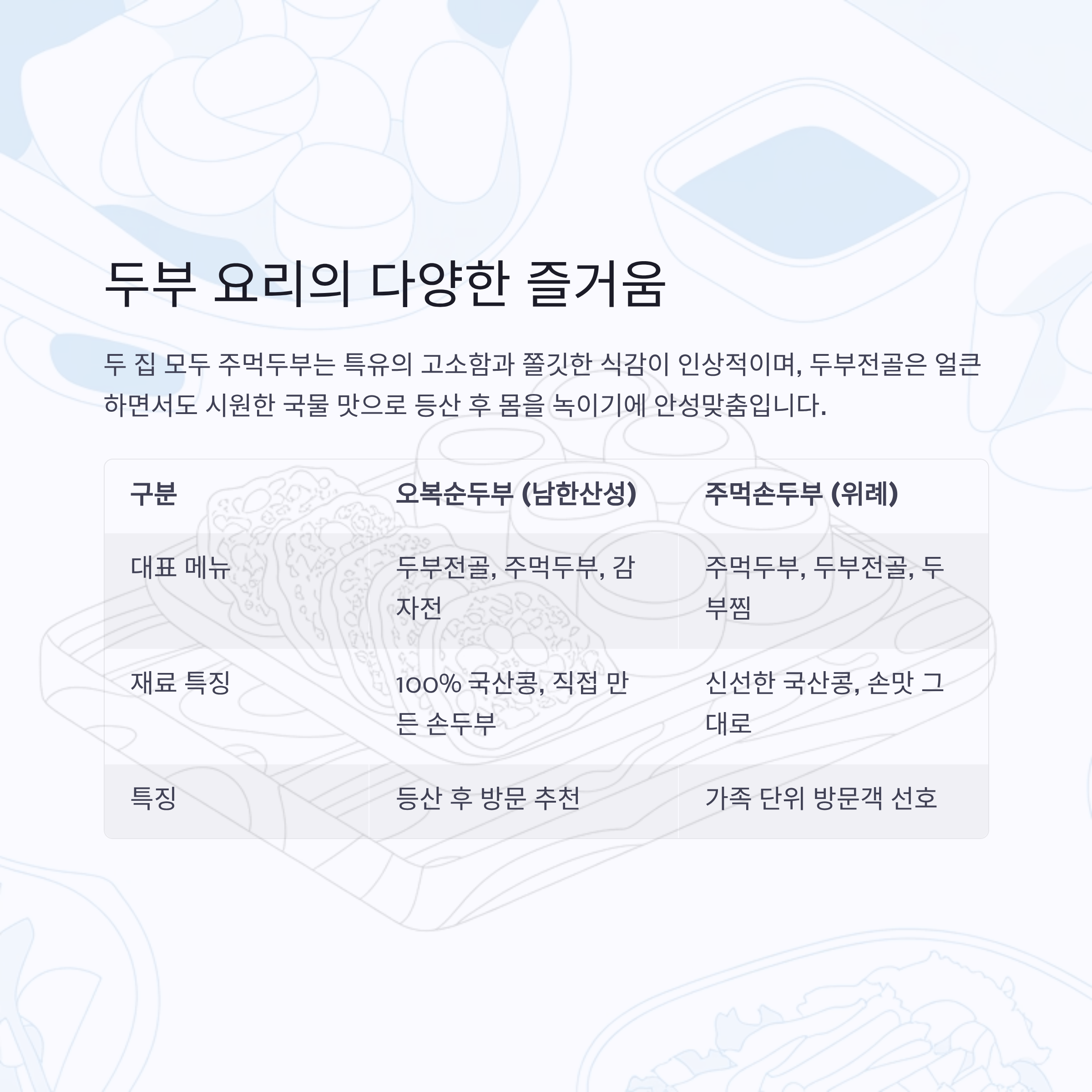 특징 등산 후 방문 추천, 얼큰한 두부전골과 고소한 주먹두부가 인기 담백하고 부드러운 두부 요리, 가족 단위 방문객 사랑받음