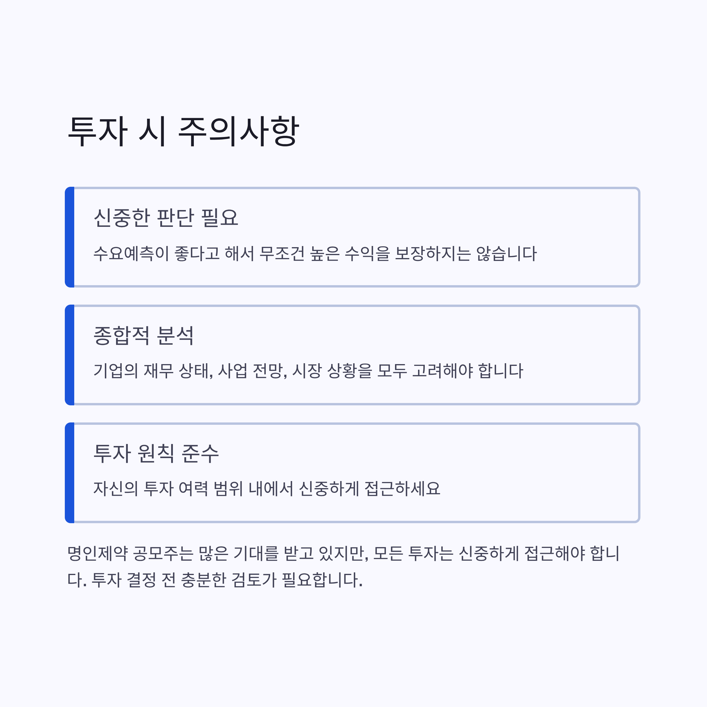 명인제약 공모주는 많은 기대를 받고 있지만, 모든 투자는 신중하게 접근해야 합니다. 수요예측 결과나 청약 경쟁률이 좋다고 해서 무조건 높은 수익을 보장하는 것은 아닙니다. 기업의 재무 상태, 사업 전망, 시장 상황 등을 종합적으로 고려하여 신중한 판단을 내리는 것이 중요합니다.
