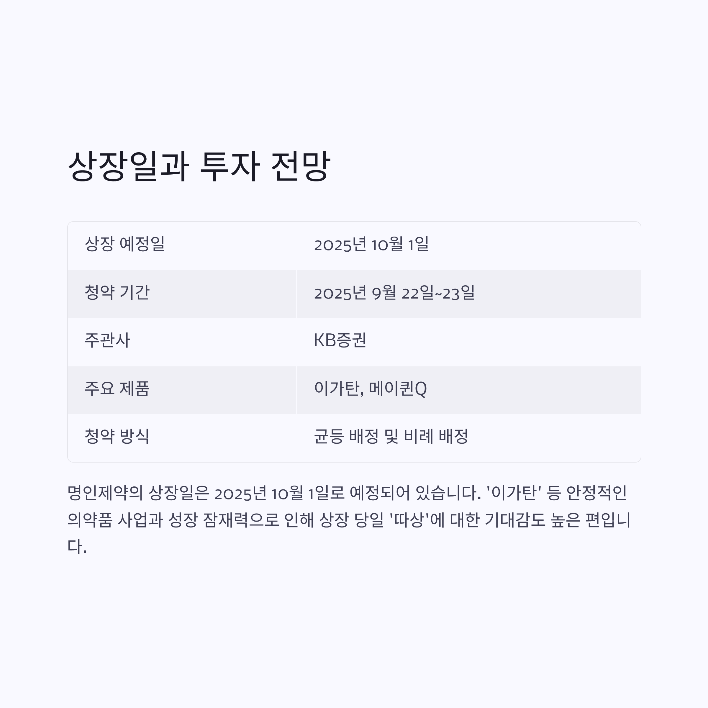 명인제약의 상장일은 2025년 10월 1일로 예정되어 있습니다. 상장 당일에는 공모가보다 높은 가격으로 시작하는 '따상'에 대한 기대감도 높은 편입니다. 명인제약의 공모주 청약 전망을 긍정적으로 보는 이유는 '이가탄' 등 안정적인 의약품 사업과 성장 잠재력입니다.