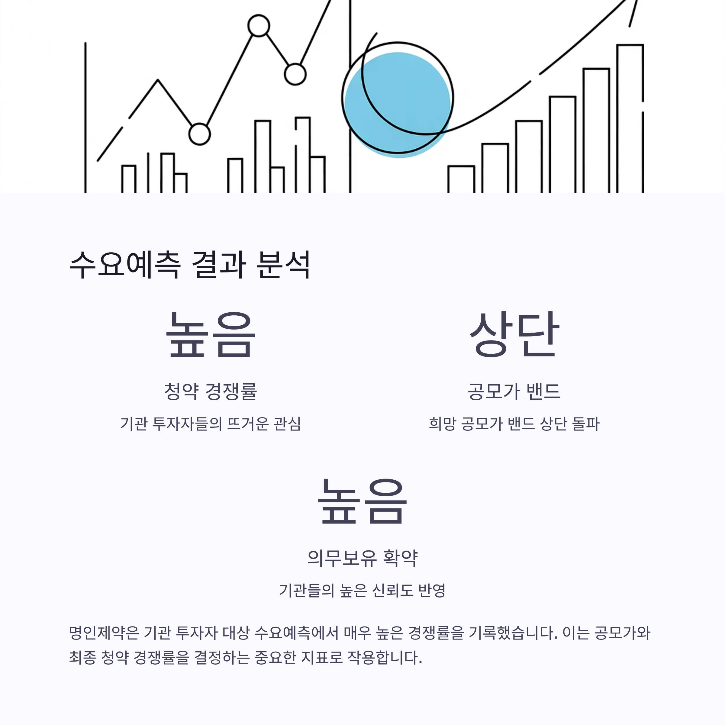 명인제약은 공모주 청약에 앞서 기관 투자자들을 대상으로 수요예측을 진행했습니다. 수요예측 결과는 공모가와 최종 청약 경쟁률을 결정하는 중요한 지표입니다. 명인제약의 경우, 경쟁률이 매우 높게 나타나 공모가가 희망 공모가 밴드 상단을 넘어섰으며, 의무 보유 확약 비율도 높은 수준으로 확인되었습니다.