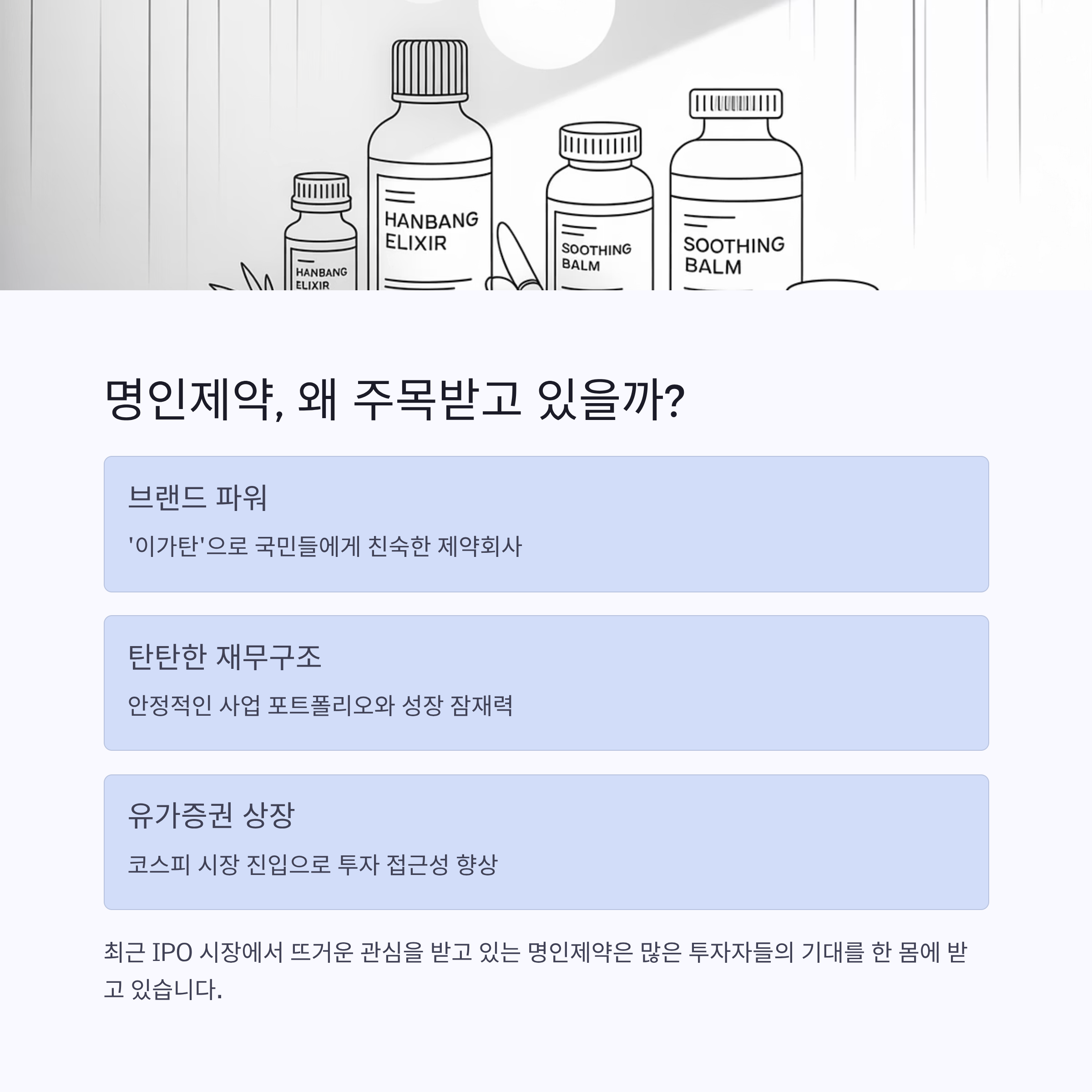 최근 IPO 시장에서 뜨거운 관심을 받고 있는 명인제약 공모주에 대해 알아보겠습니다. '이가탄'으로 우리에게 잘 알려진 명인제약은 이번 공모를 통해 유가증권 시장에 상장될 예정입니다. 탄탄한 재무 구조와 안정적인 사업 포트폴리오를 갖추고 있어 많은 투자자들의 기대를 한 몸에 받고 있는데요. 오늘은 명인제약 공모주 청약에 대한 모든 것을 자세히 알려드리겠습니다.