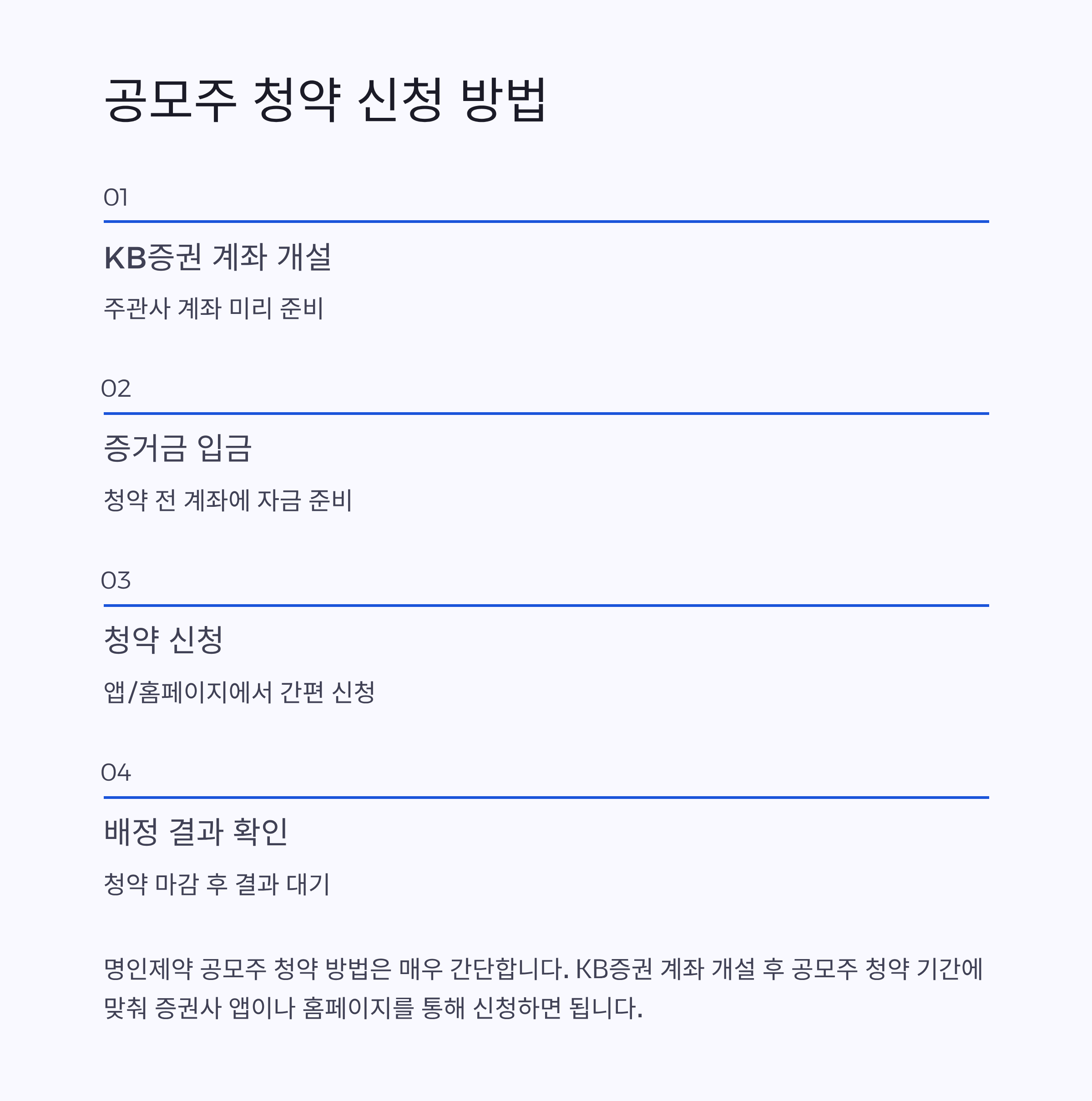명인제약 공모주 청약 방법은 매우 간단합니다. 우선 KB증권 계좌를 개설한 후, 공모주 청약 기간에 맞춰 증권사 앱이나 홈페이지를 통해 청약 신청을 하면 됩니다. 공모주 청약 증거금은 미리 계좌에 넣어두는 것이 좋습니다.