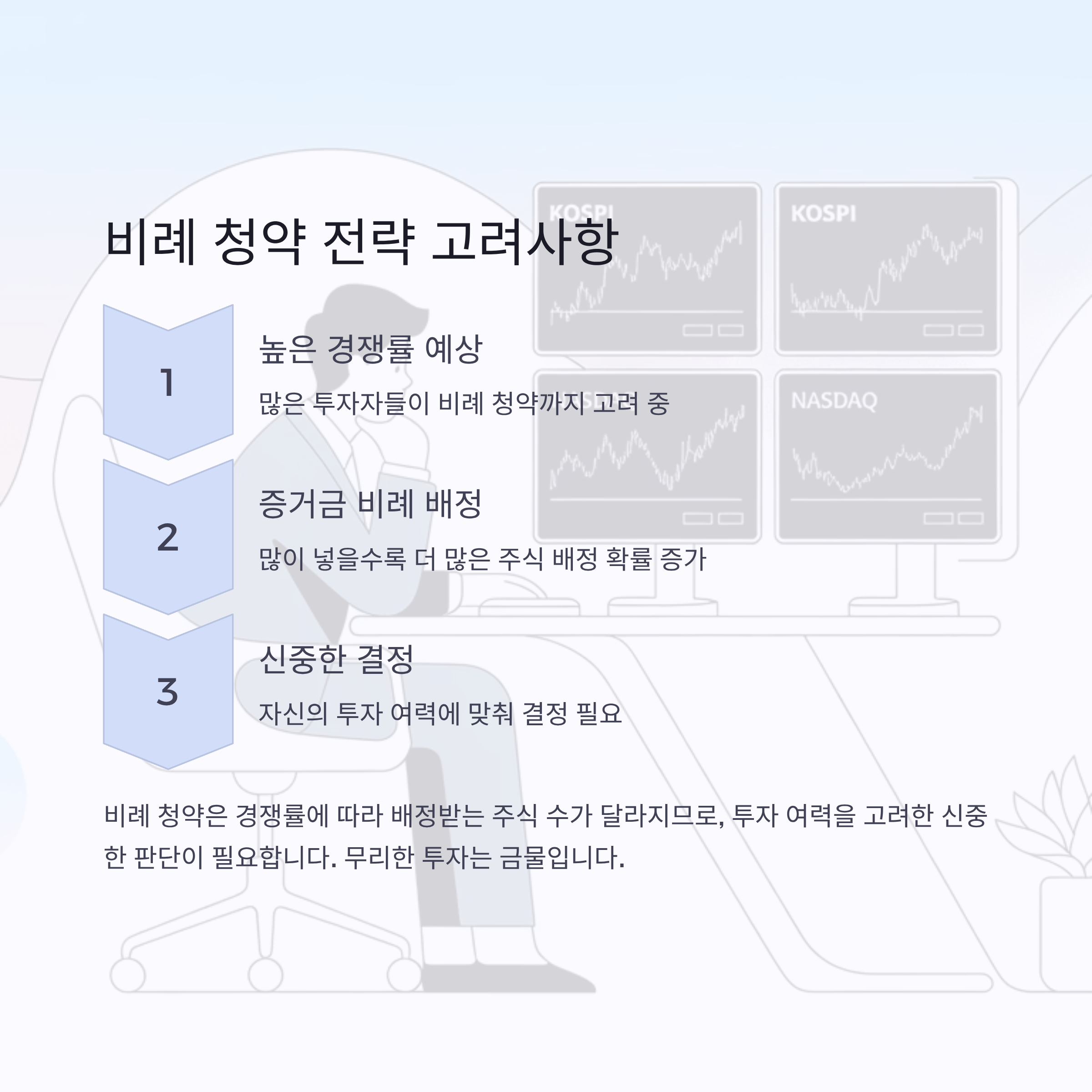 명인제약 공모주 청약에서 높은 경쟁률을 예상하는 투자자들은 비례 청약까지 고려하고 있습니다. 비례 청약은 많은 증거금을 납입할수록 더 많은 주식을 배정받을 확률이 높아지기 때문입니다. 하지만 비례 청약은 경쟁률에 따라 배정받는 주식 수가 달라지므로, 자신의 투자 여력에 맞춰 신중하게 결정해야 합니다.