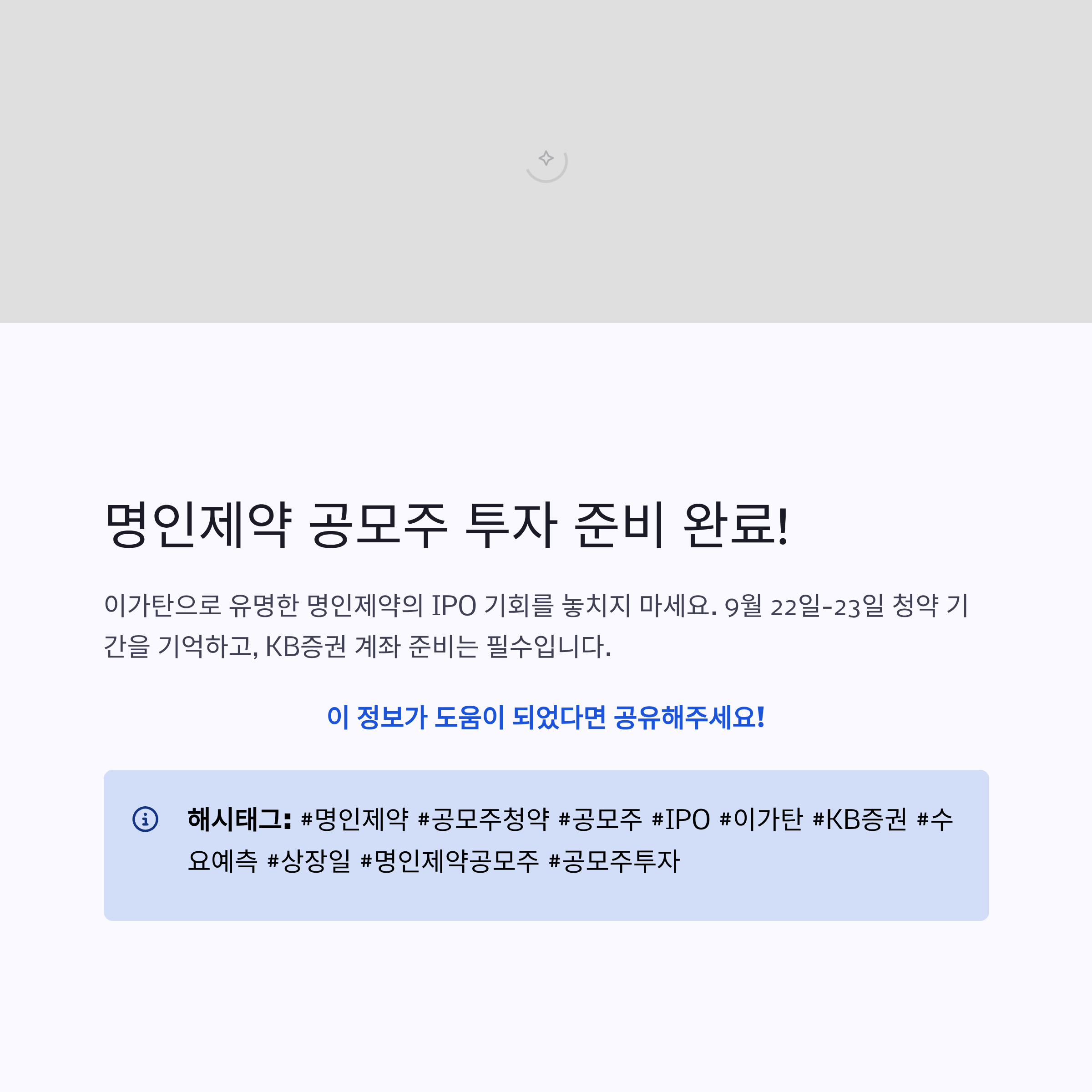 명인제약 공모주 청약은 2025년 9월 22일과 23일 이틀간 진행됩니다. 공모주 청약을 위해서는 주관사인 KB증권 계좌를 미리 개설해두어야 합니다. 주관사별 청약 배정 물량과 청약 증거금 등 상세 내용은 공모주 청약 공고를 통해 확인할 수 있습니다.