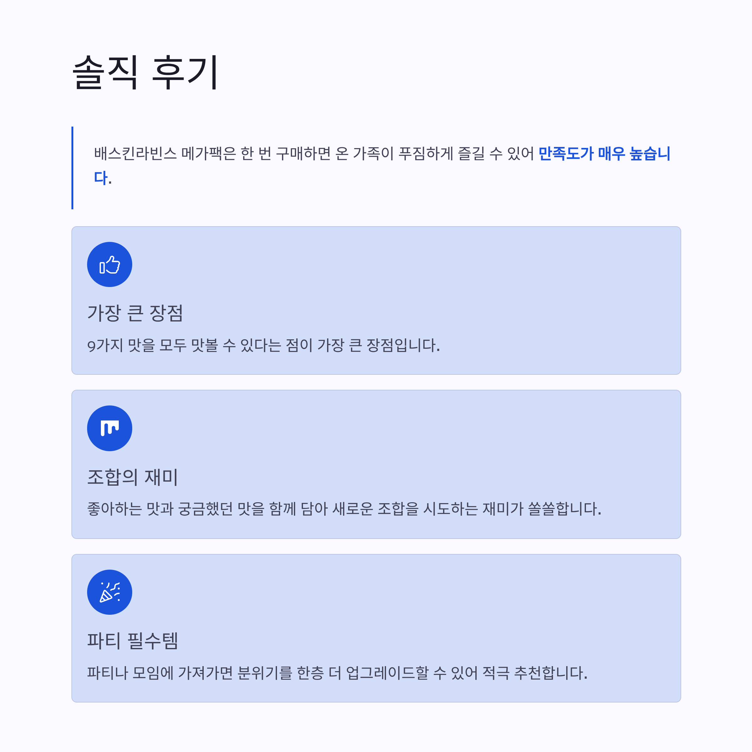 배스킨라빈스 메가팩은 한 번 구매하면 온 가족이 푸짐하게 즐길 수 있어 만족도가 매우 높습니다. 9가지 맛을 모두 맛볼 수 있다는 점이 가장 큰 장점인데요. 좋아하는 맛과 궁금했던 맛을 함께 담아 새로운 조합을 시도하는 재미가 쏠쏠합니다. 특히 파티나 모임에 가져가면 분위기를 한층 더 업그레이드할 수 있어 적극 추천합니다.