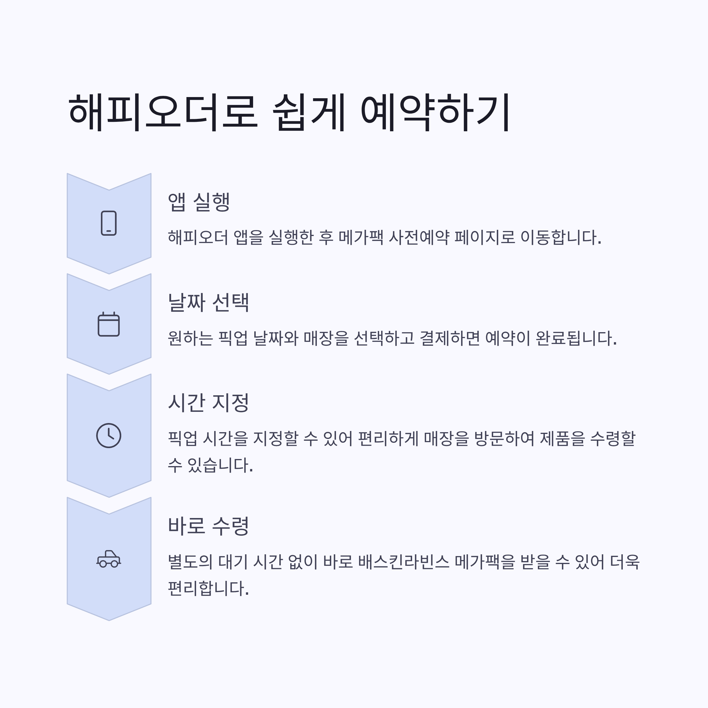 해피오더 앱을 이용하면 배스킨라빈스 메가팩 사전예약을 손쉽게 할 수 있습니다. 앱을 실행한 후 메가팩 사전예약 페이지로 이동하여 원하는 픽업 날짜와 매장을 선택하고 결제하면 예약이 완료됩니다. 예약 시에는 픽업 시간을 지정할 수 있어 편리하게 매장을 방문하여 제품을 수령할 수 있습니다. 사전예약을 하면 별도의 대기 시간 없이 바로 배스킨라빈스 메가팩을 받을 수 있어 더욱 편리합니다.