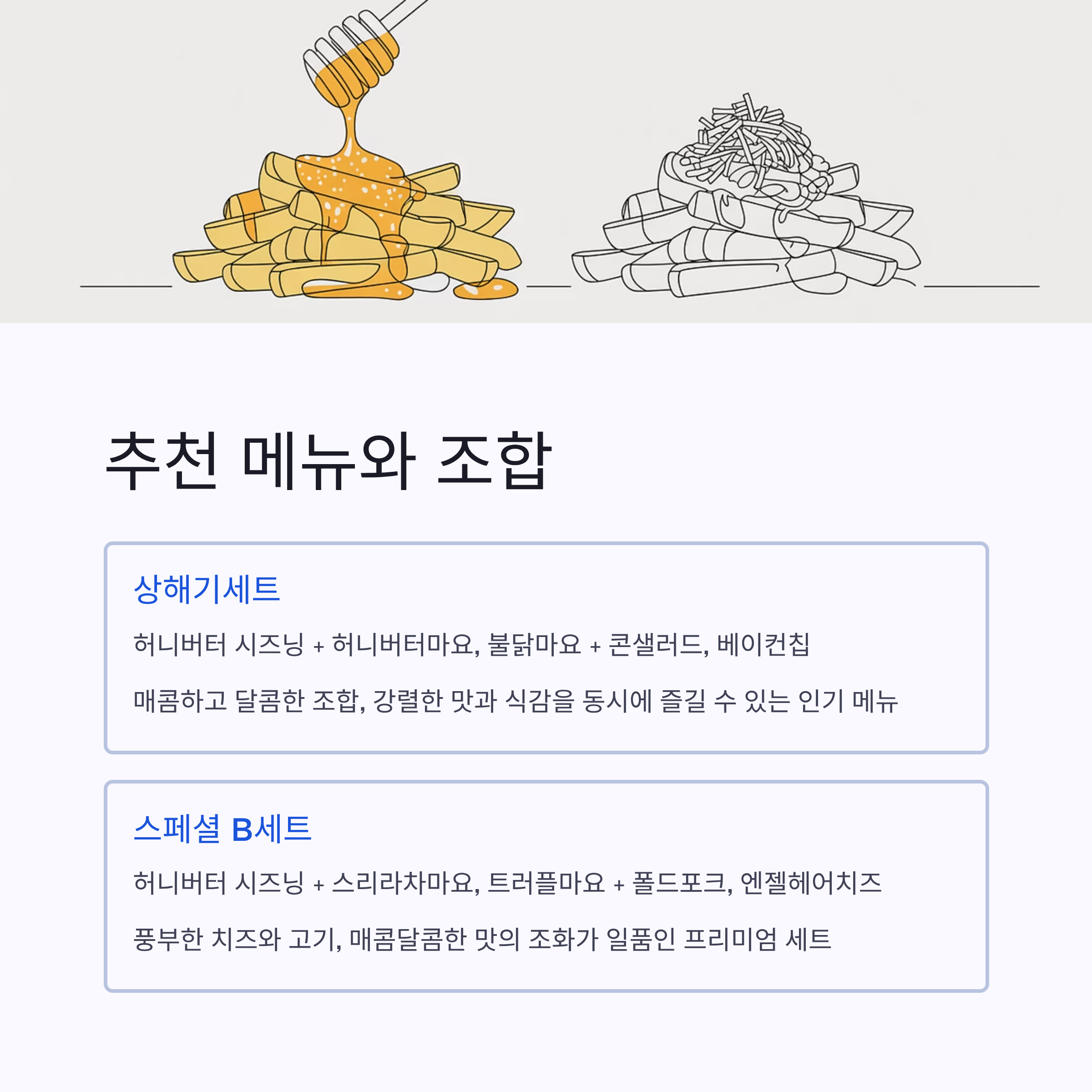 상해기세트 | 허니버터 시즈닝 + 허니버터마요, 불닭마요 + 콘샐러드, 베이컨칩 | 매콤하고 달콤한 조합, 강렬한 맛과 식감 |