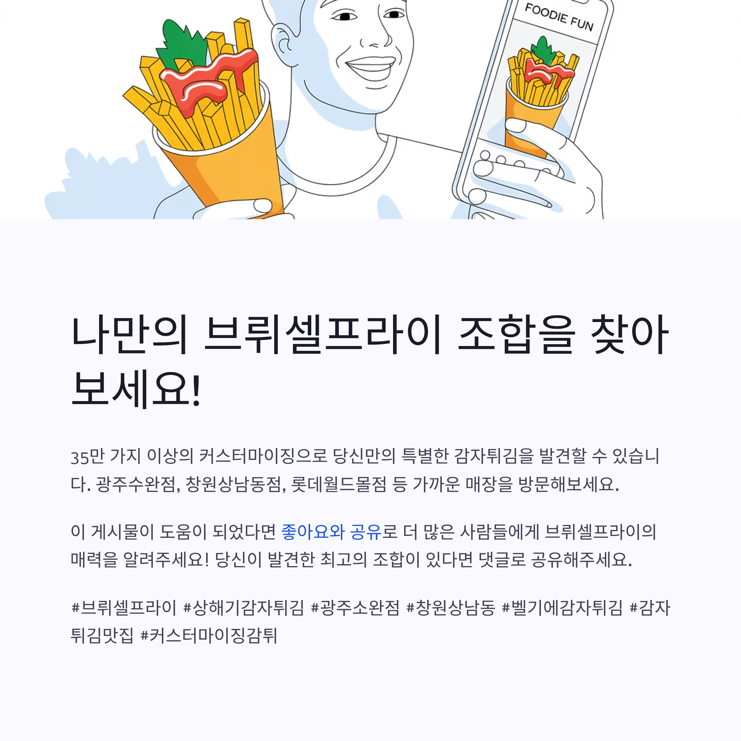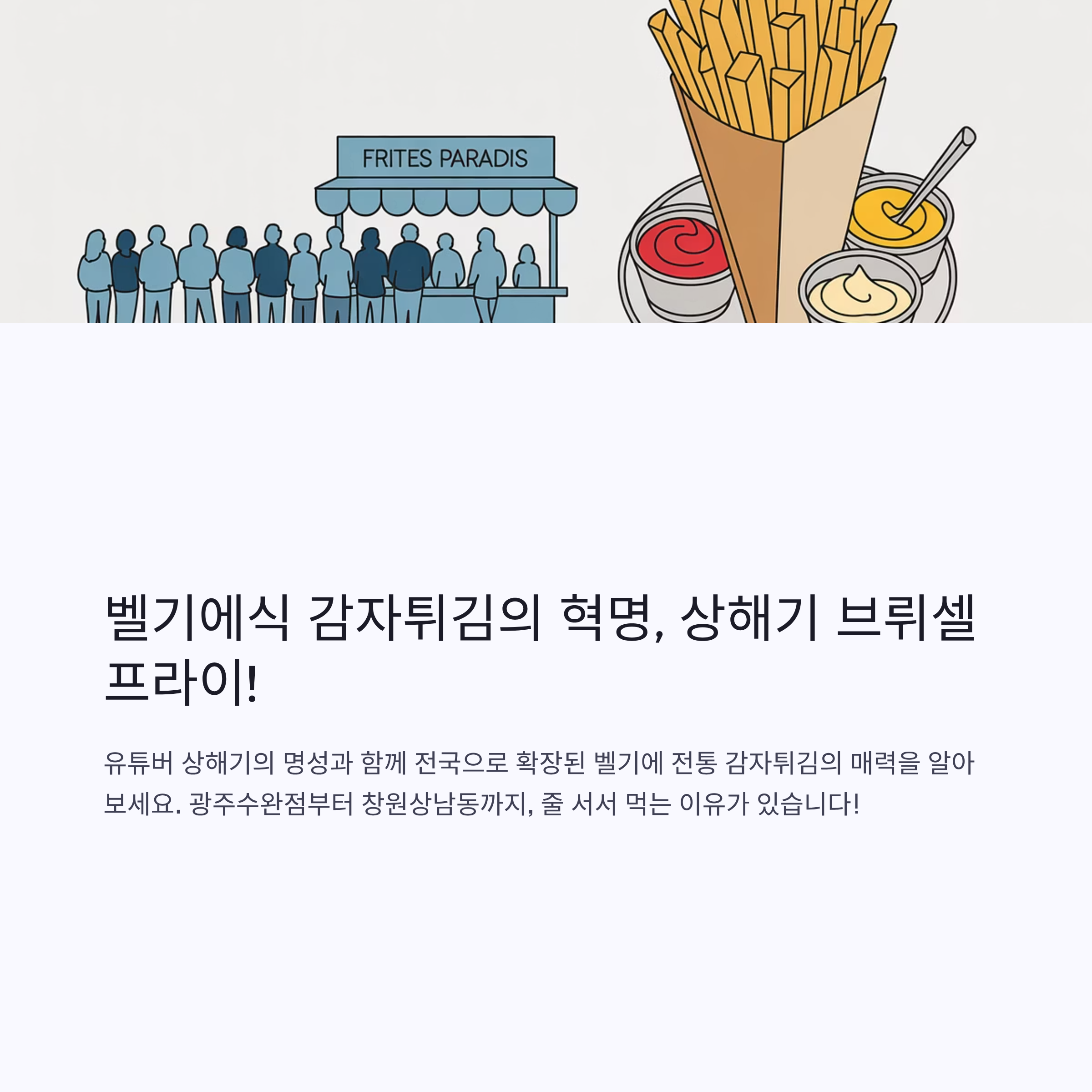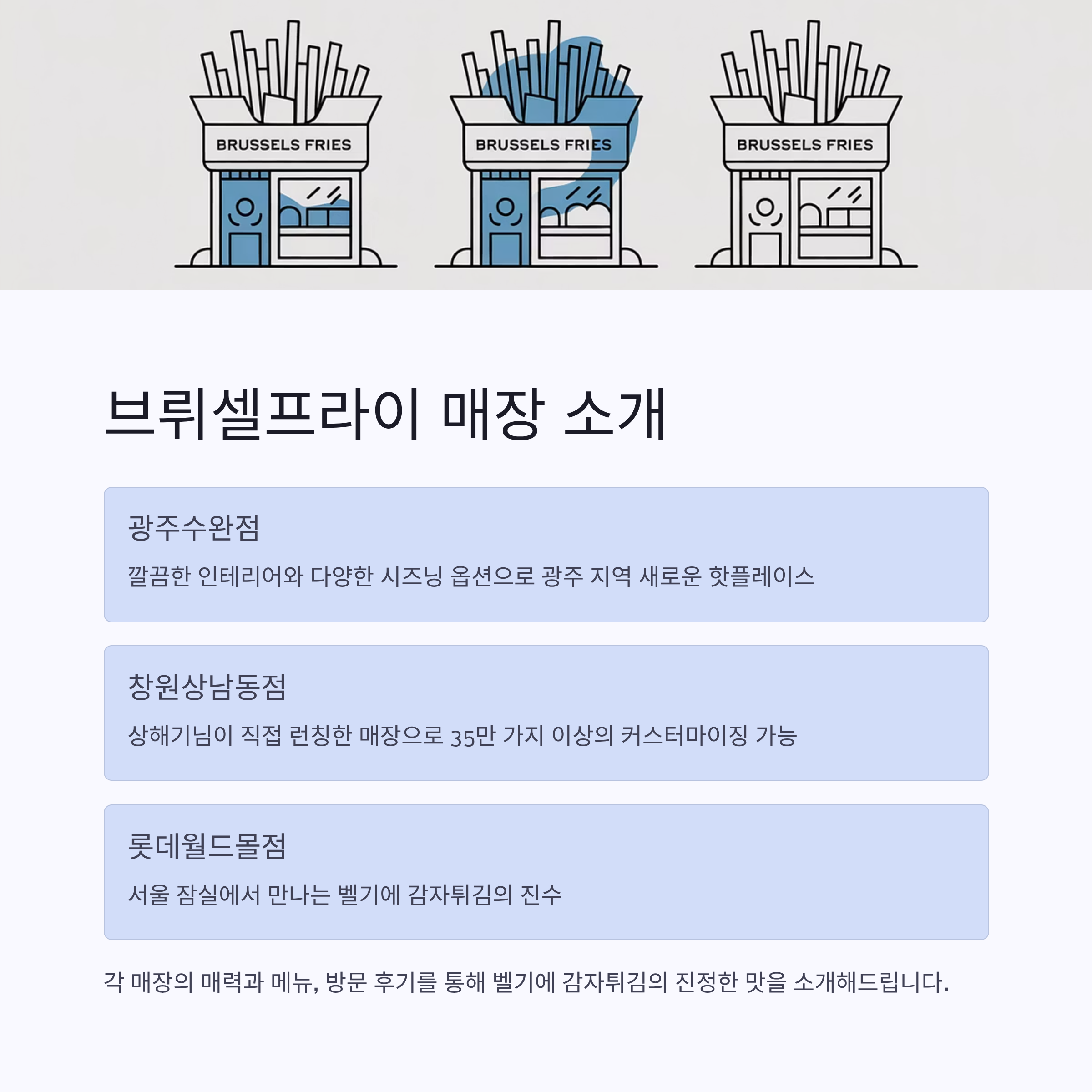 광주수완점과 창원상남동점을 비롯한 브뤼셀프라이 매장의 매력과 메뉴, 방문 후기를 소개해드릴게요. 벨기에 감자튀김의 매력과 다양한 소스 조합, 현장 분위기까지 생생하게 전합니다.