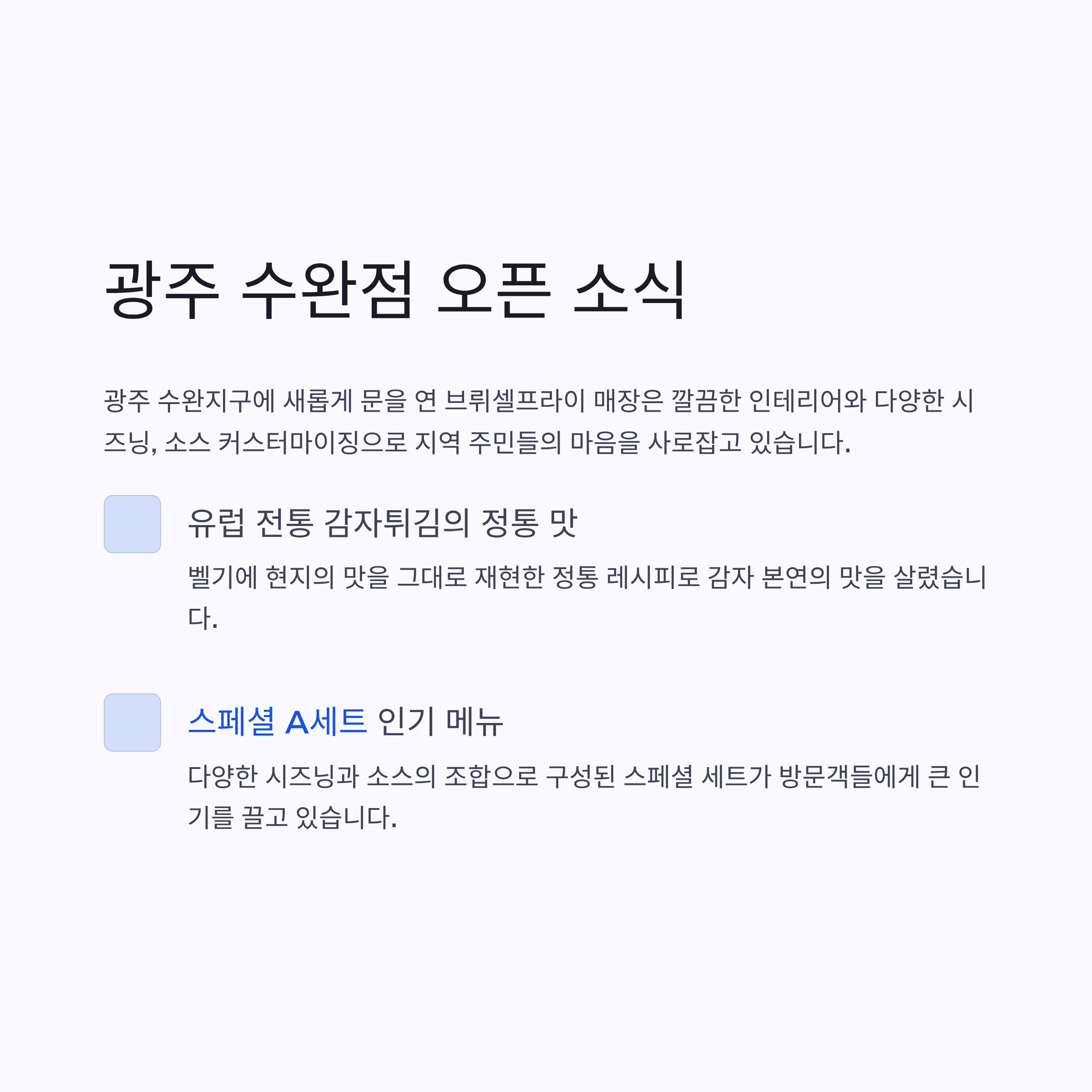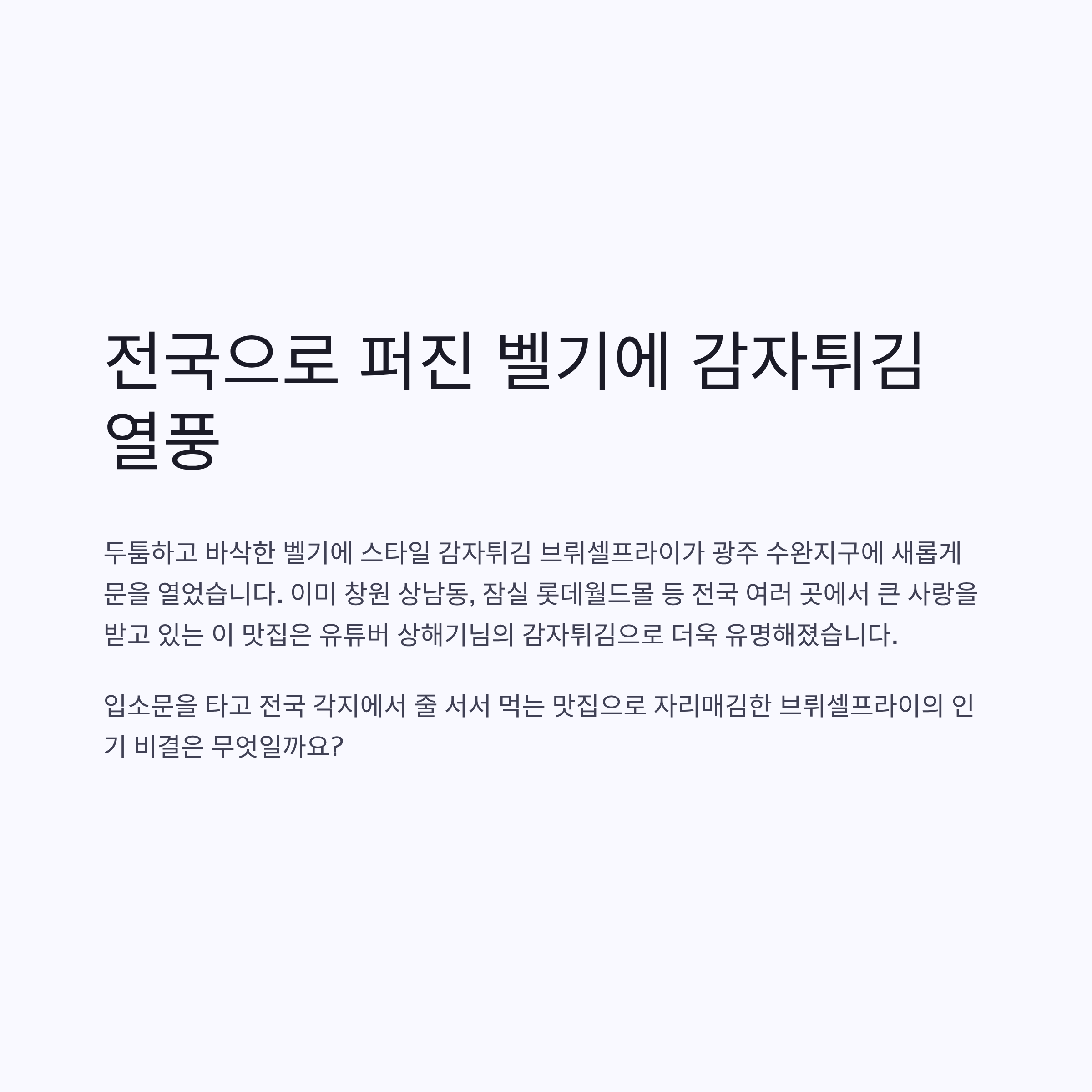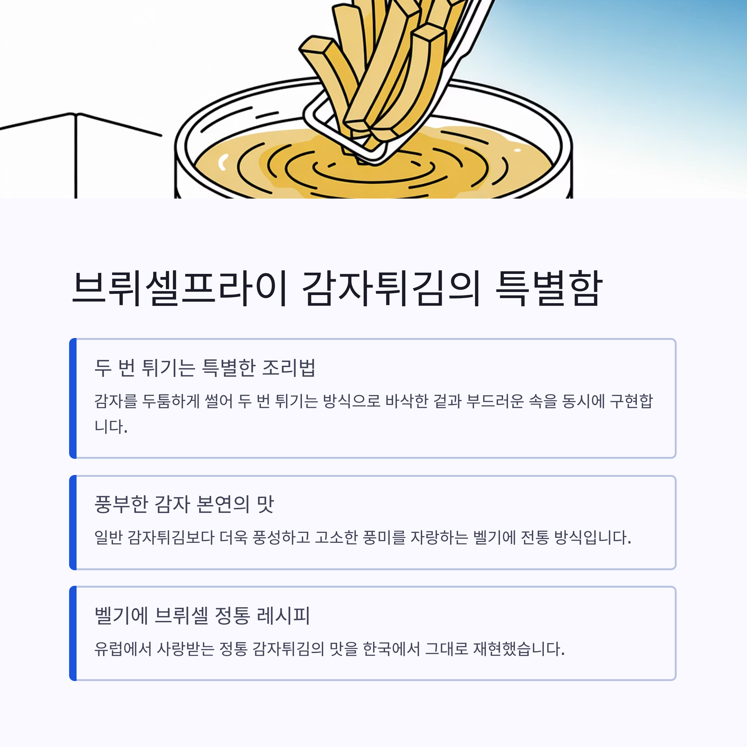 광주수완점과 창원상남동점을 비롯한 브뤼셀프라이 매장의 매력과 메뉴, 방문 후기를 소개해드릴게요. 벨기에 감자튀김의 매력과 다양한 소스 조합, 현장 분위기까지 생생하게 전합니다.