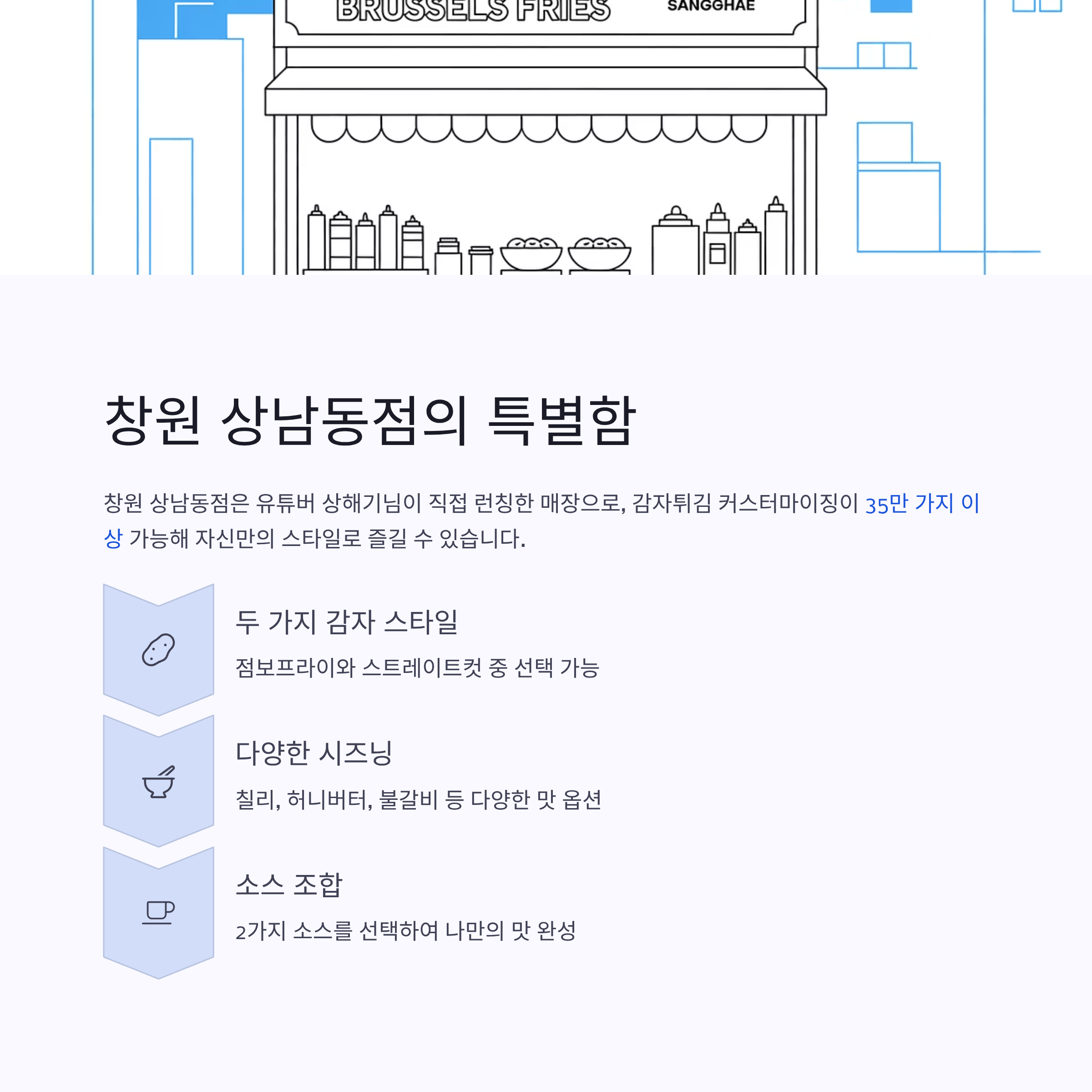 창원 상남동점은 유튜버 상해기님이 직접 런칭한 매장으로, 감자튀김 커스터마이징이 35만 가지 이상 가능해 자기만의 스타일로 즐길 수 있습니다. 두 가지 감자 스타일(점보프라이, 스트레이트컷)과 다양한 시즈닝(칠리, 허니버터, 불갈비 등), 그리고 2가지 소스 조합이 특징입니다.