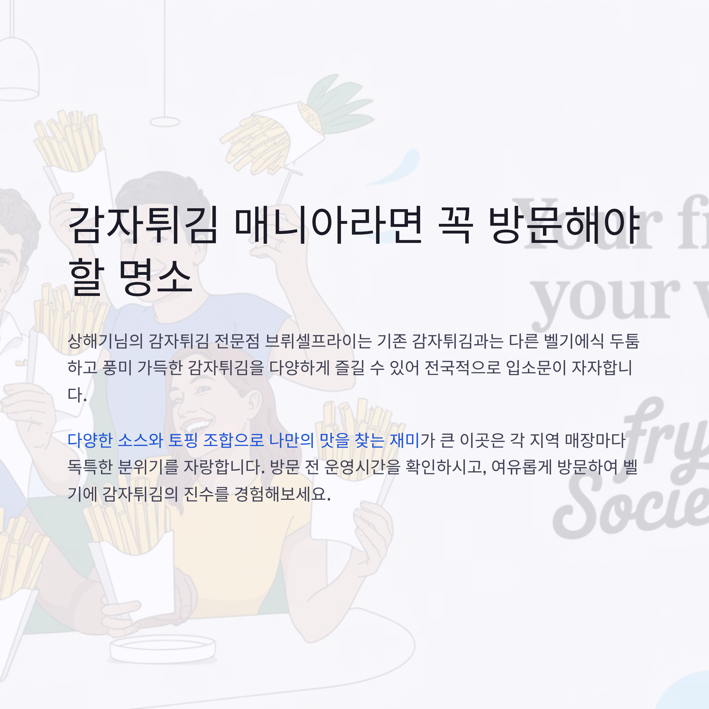상해기님의 감자튀김 전문점 브뤼셀프라이는 기존 감자튀김과는 다른 벨기에식 두툼하고 풍미 가득한 감자튀김을 다양하게 즐길 수 있어 전국적으로 입소문이 자자합니다. 특히 다양한 소스와 토핑 조합으로 나만의 맛을 찾는 재미가 큽니다. 각 지역 매장의 분위기와 운영시간을 잘 확인 후 방문하시길 권해드립니다.