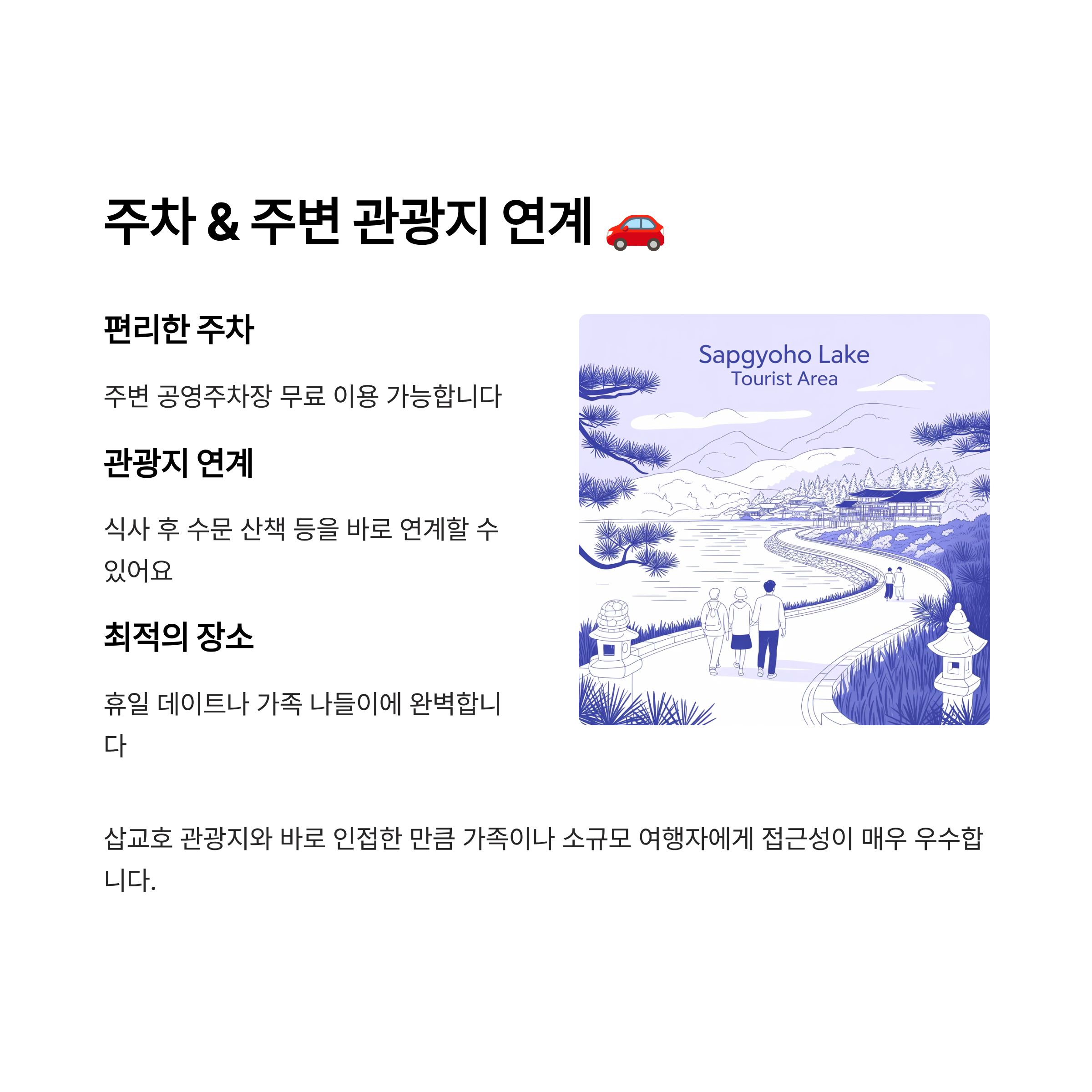 주변 공영주차장 무료 이용 가능, 식사 후 수문 산책 등을 바로 연계할 수 있어 휴일 데이트나 가족 나들이에 최적입니다.