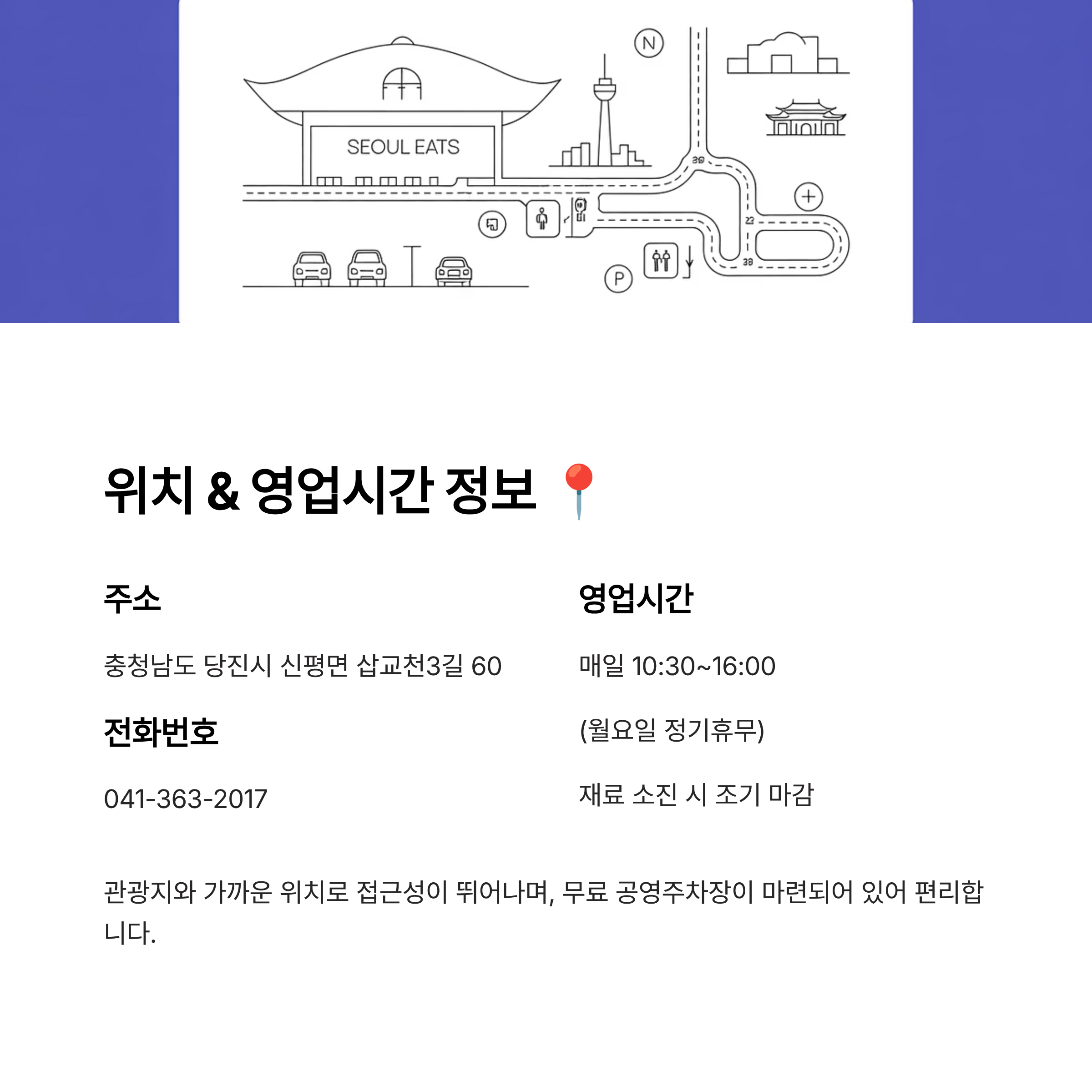 관광지와 가까운 위치로 접근성이 뛰어나며, 무료 공영주차장이 마련되어 있습니다.