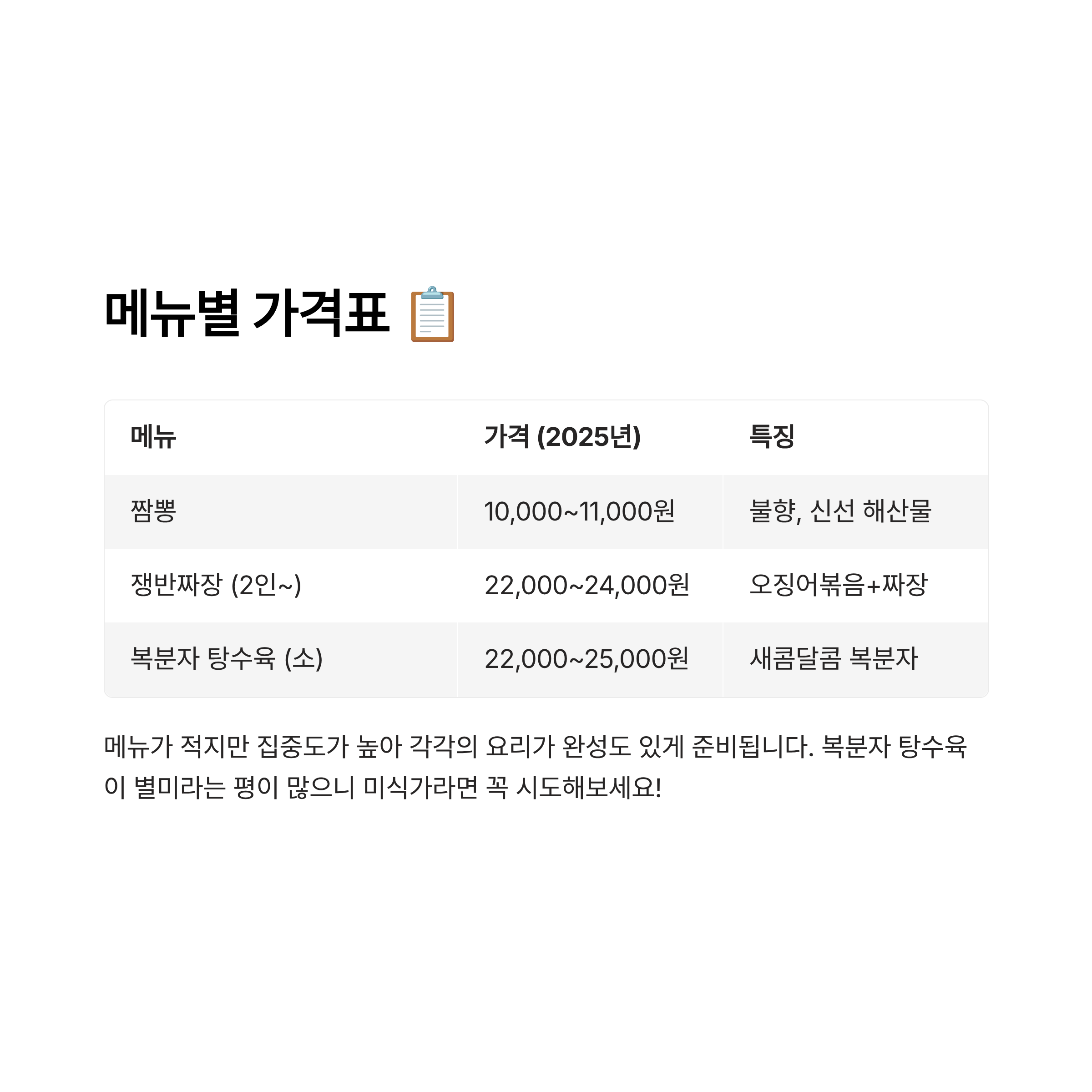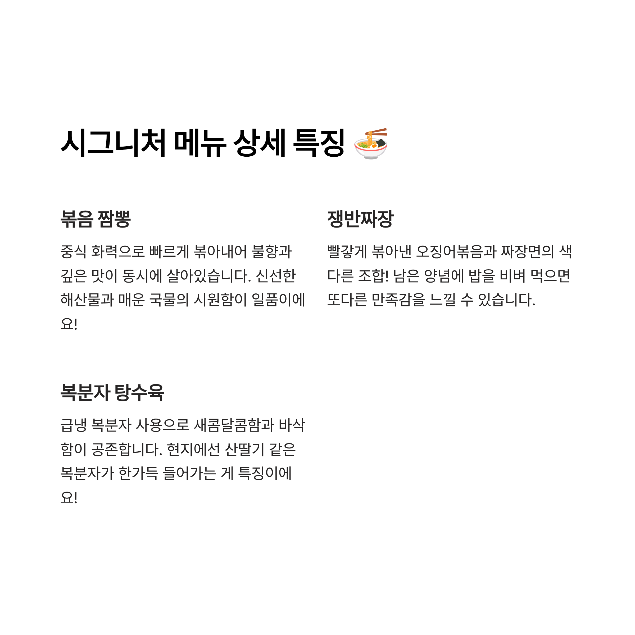 짬뽕 | 10,000~11,000원 | 불향, 신선 해산물, 매운 국물 |