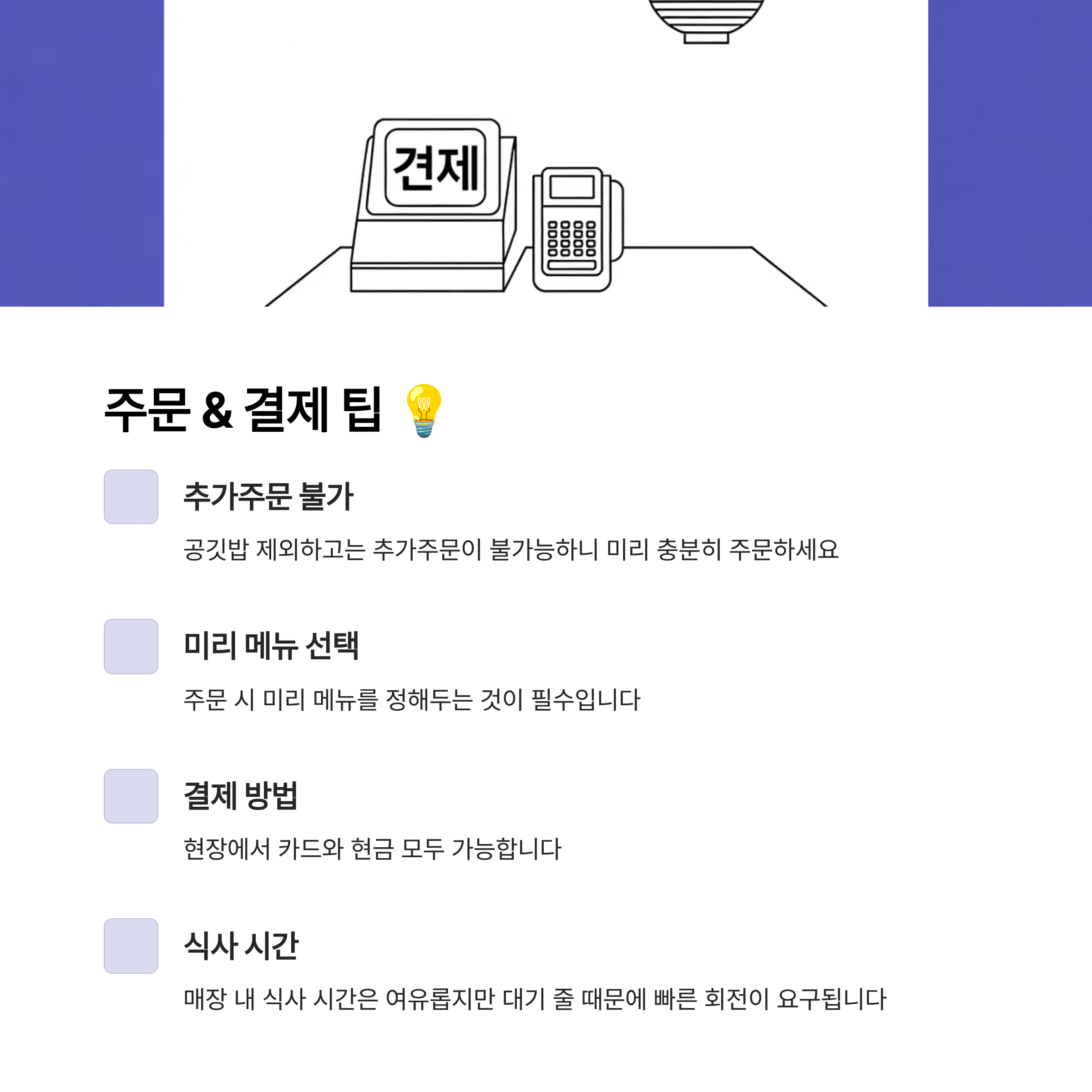 매장 내 식사 시간은 대체로 여유로운 편이나, 대기 줄 목적상 빠른 회전이 요구됨