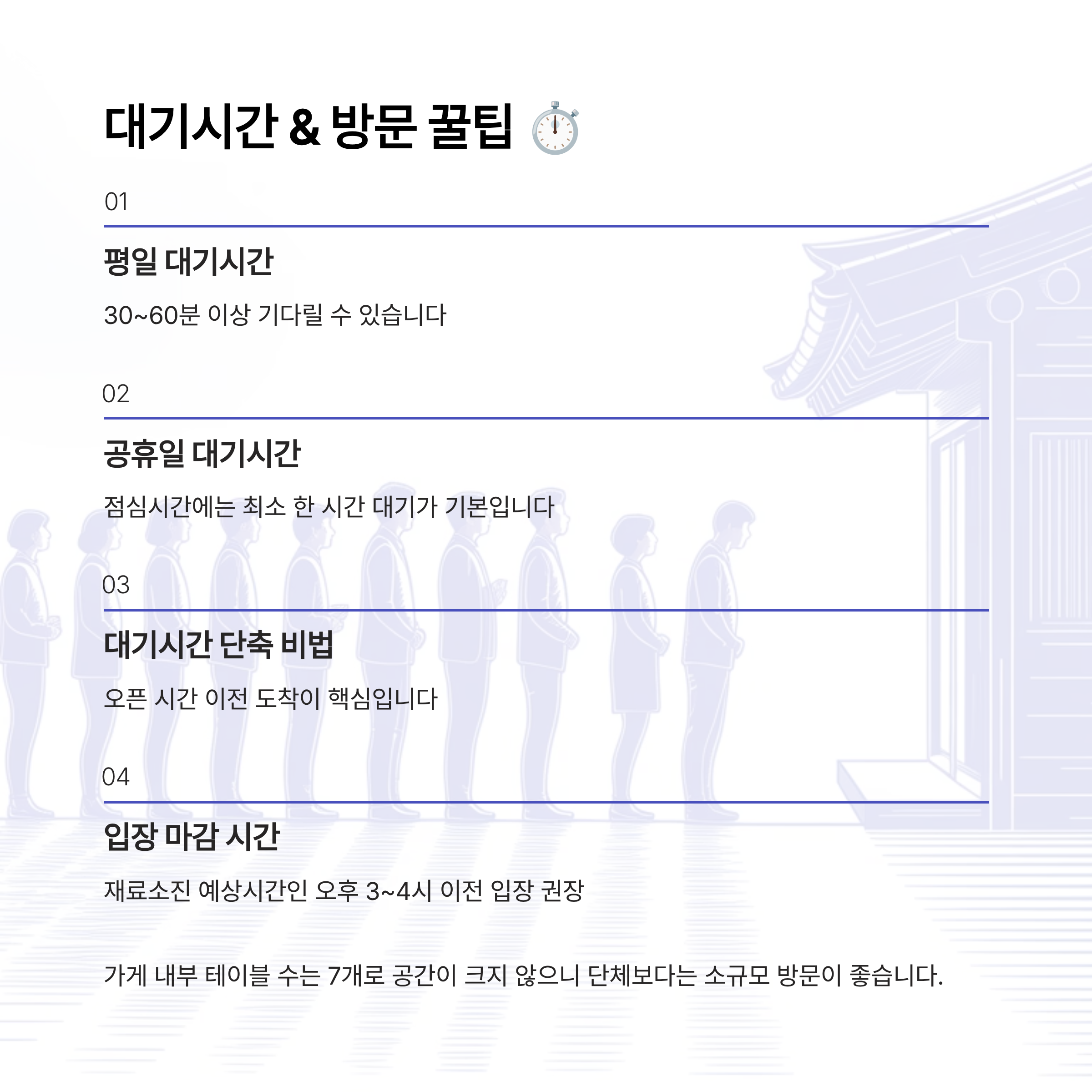 대기 시간 단축 비법은 "오픈 시간 이전 도착", "재료소진 예상시간 오후 3~4시 이전 입장"이 기본입니다.