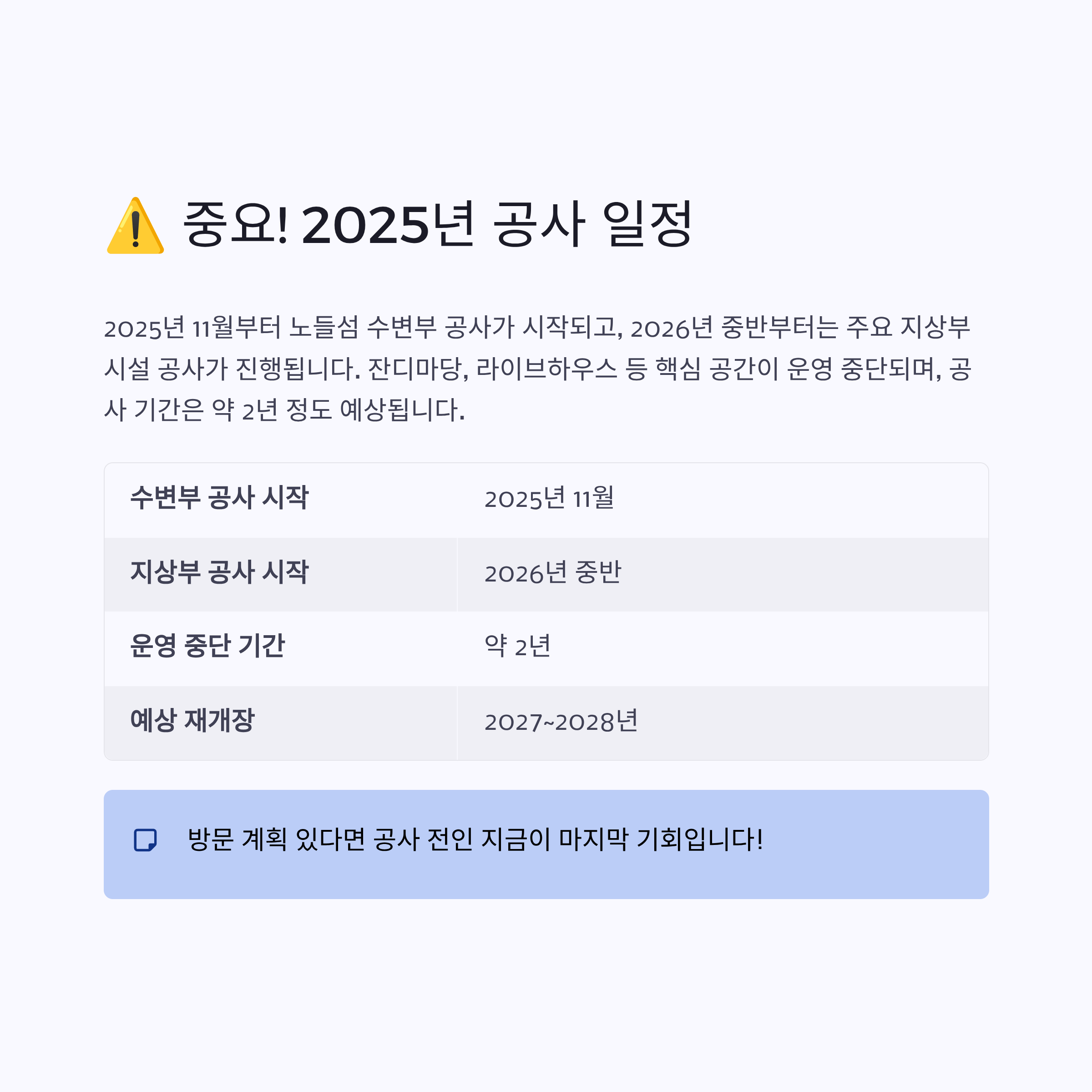 2025년 11월부터 노들섬 수변부 공사가 시작되고, 2026년 중반부터는 주요 지상부 시설 공사가 진행됩니다. 이에 따라 잔디마당, 라이브하우스 등 핵심 공간이 운영 중단되며, 공사 기간은 약 2년 정도 예상됩니다. 방문 계획 있다면 공사 전인 지금이 마지막 기회입니다.