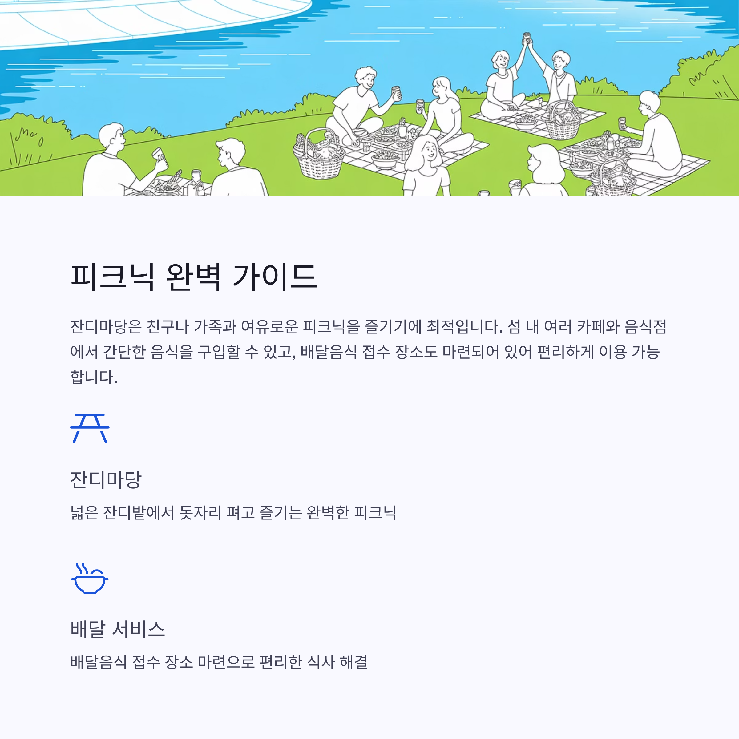 잔디마당은 친구나 가족과 여유로운 피크닉을 즐기기에 최적입니다. 섬 내 여러 카페와 음식점에서 간단한 음식을 구입할 수 있고, 배달음식 접수 장소도 마련되어 있어 편리하게 이용 가능합니다. 해질 무렵 노을과 야경까지 잡으면 하루가 더욱 특별해집니다.