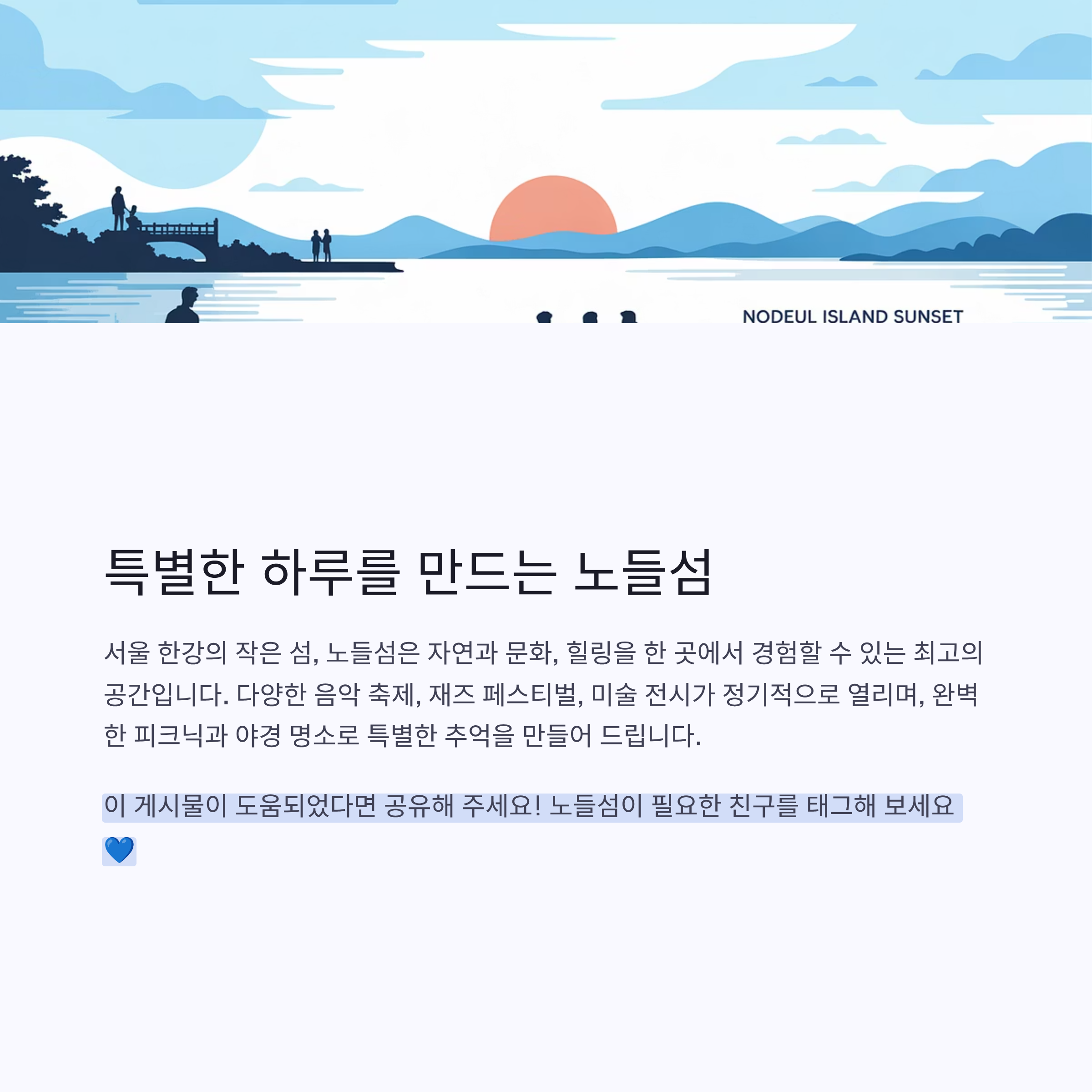 서울 한강의 작은 섬, 노들섬은 자연과 문화, 힐링을 한 곳에서 경험할 수 있는 최고의 공간입니다. 완벽한 피크닉과 야경 명소인 노들섬에서 특별한 하루를 보내 보시길 바랍니다.