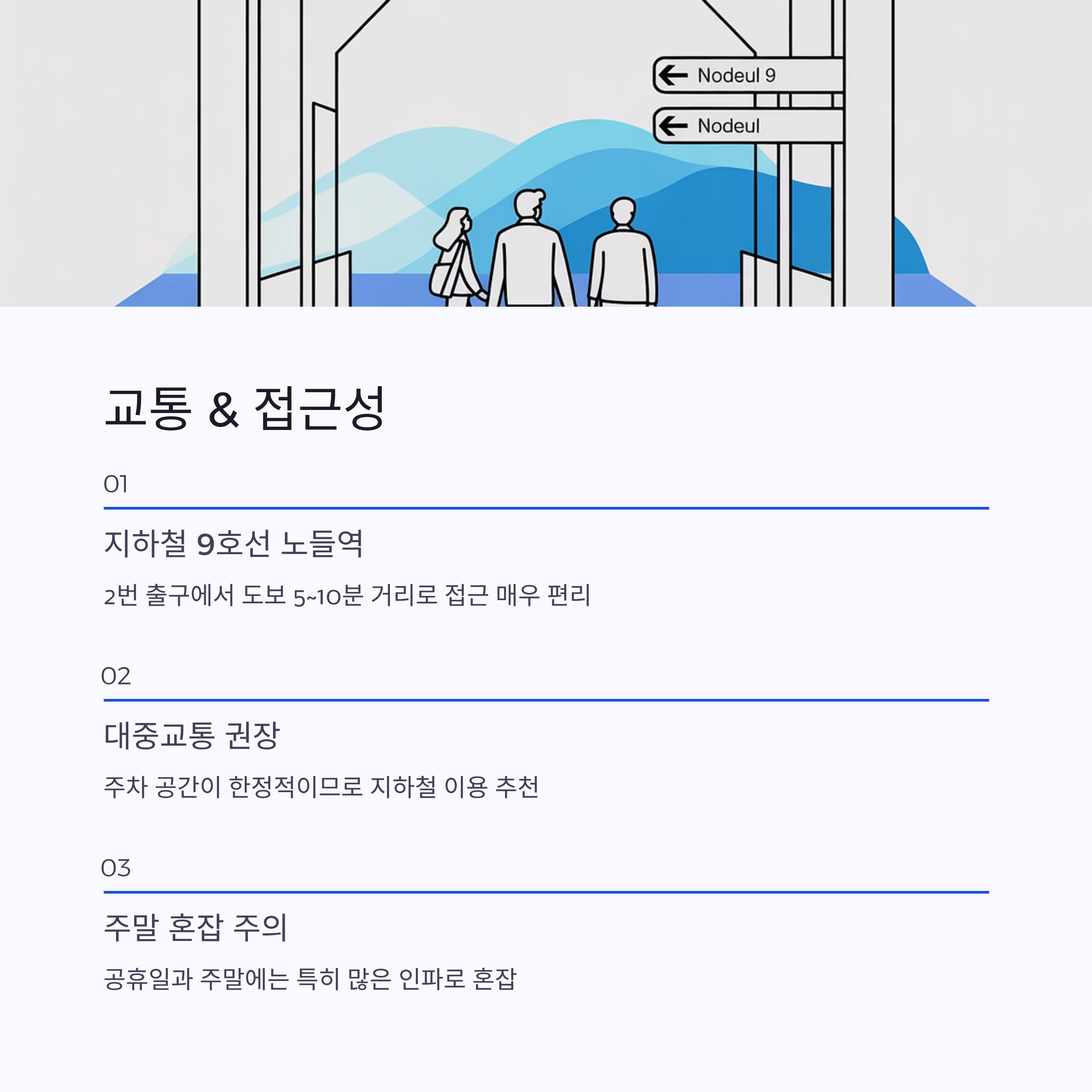 노들섬은 지하철 9호선 노들역 2번 출구에서 도보 5~10분 거리로 접근이 매우 편리합니다. 차량 방문시 주차 공간이 한정적이므로 대중교통 이용을 권장하며, 주말이나 공휴일에는 특히 혼잡할 수 있습니다.