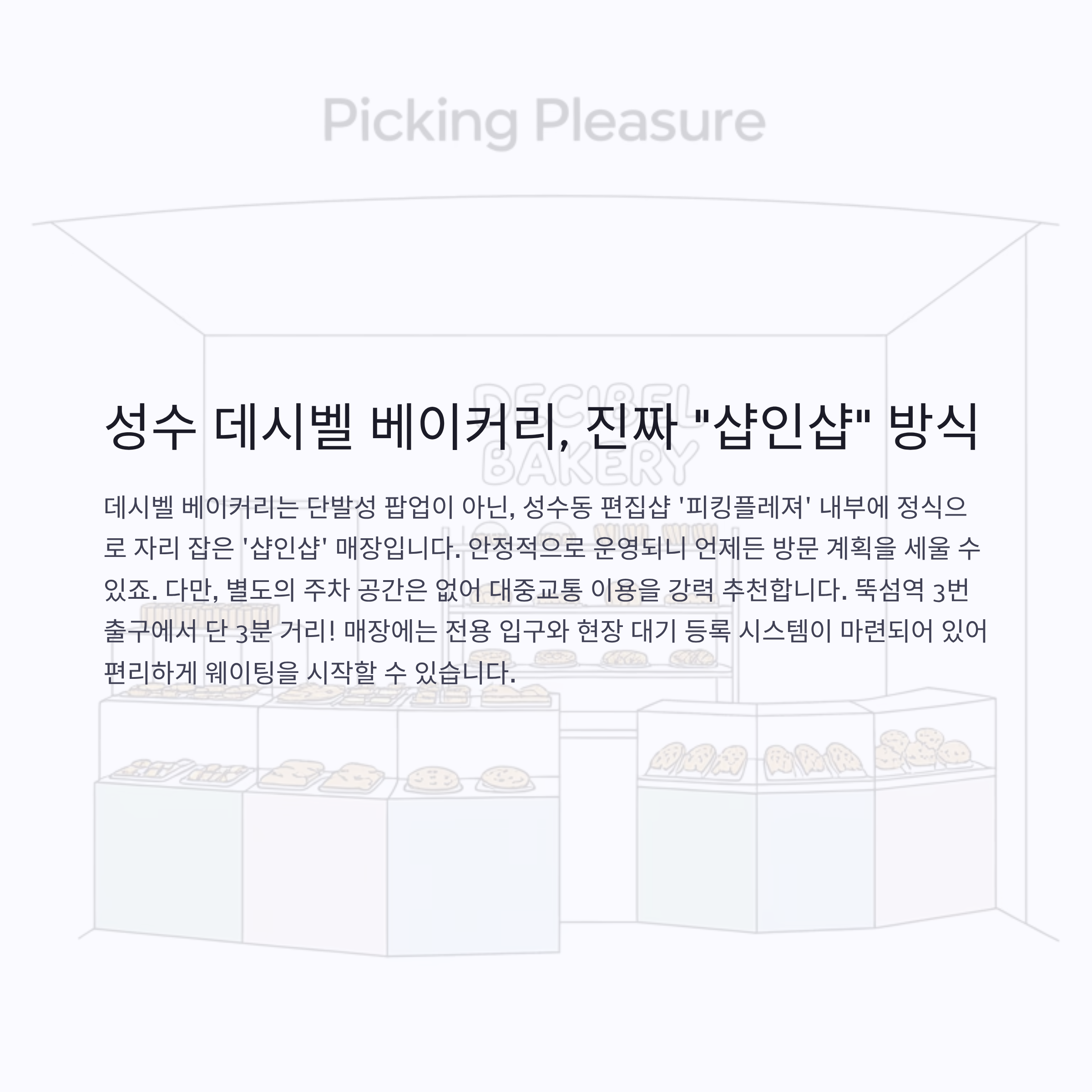 영업시간은 오전 11시~오후 7시이며, 브레이크타임이 있을 수 있습니다. 주차 공간은 별도로 마련되어 있지 않아, 대중교통 이용을 권장합니다. 피킹플레져 카페와 함께 운영되므로 공간 활용과 대기가 자유롭습니다. 품절 시간, 대기 인원, 특별 이벤트 등은 매장 SNS로 반드시 사전 확인하세요.