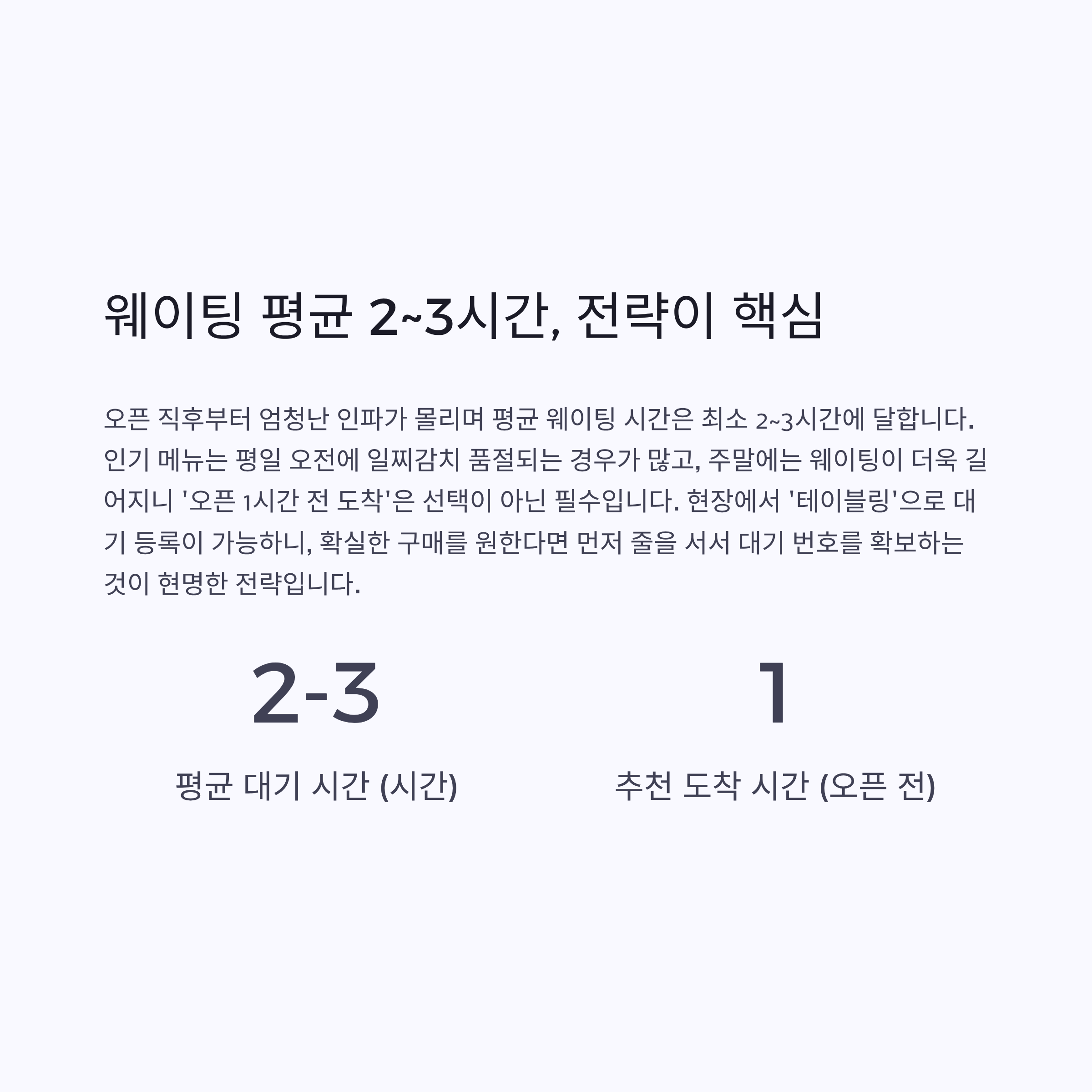 평일 오전 11시 오픈과 동시에 입장하면 대기 없이 빠르게 구매 가능하며, 특히 화요일과 목요일이 한산합니다. 주말은 토요일보다 일요일 오전이 비교적 덜 붐비고, 날씨가 좋지 않은 날은 대기가 줄어든다는 후기도 많습니다. 매장 인스타그램 실시간 공지와 품절 정보를 미리 확인하고 방문하면 실패 확률을 낮출 수 있습니다.