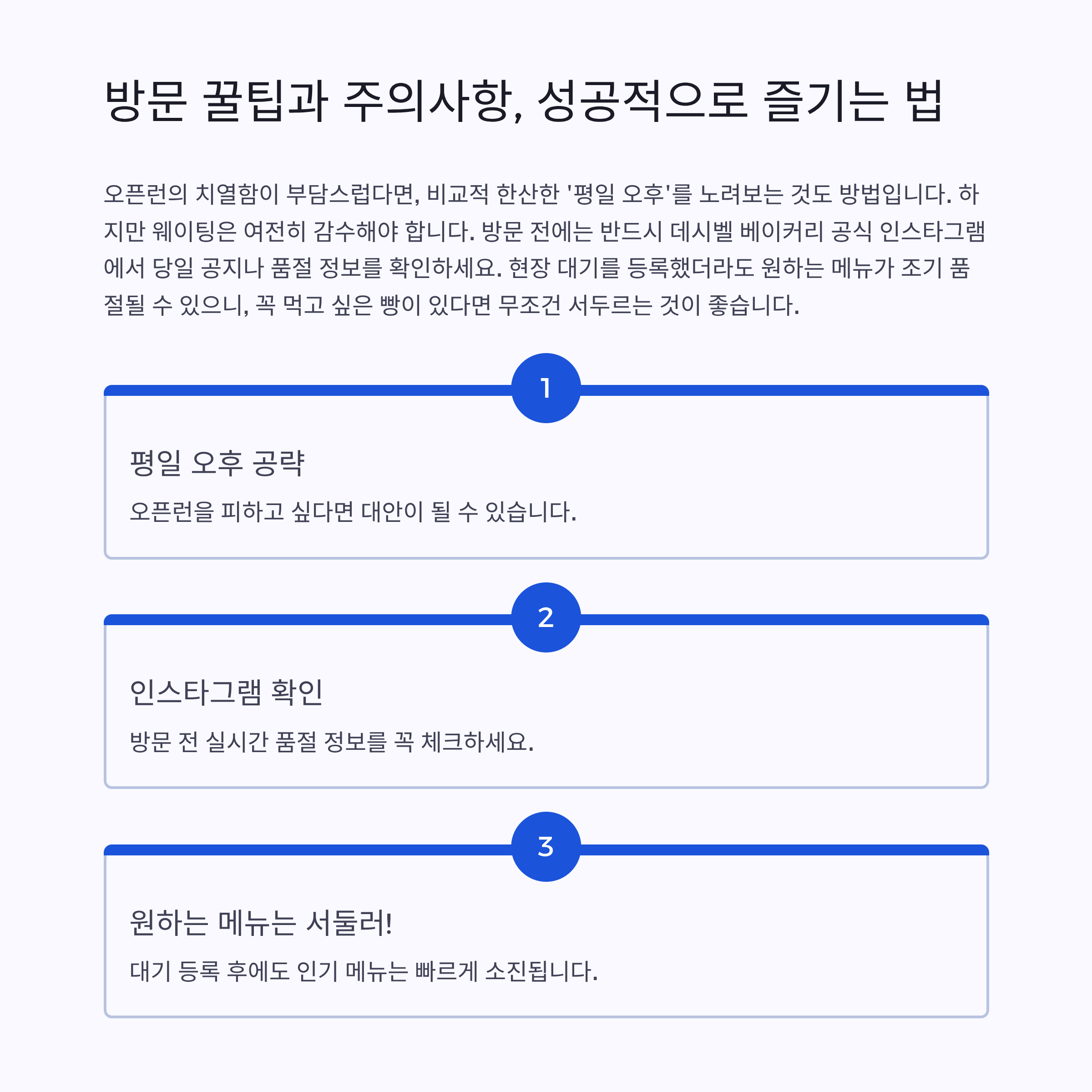 성수 데시벨 베이커리는 평일 오전 11시 오픈과 동시에 방문하면 비교적 대기가 짧습니다. 반면 주말에는 오전 8시경부터 줄이 시작되어, 오픈 2~3시간 전 도착이 안전합니다. 오후 시간대에는 원하는 메뉴가 품절될 확률이 높으니, 오전 방문이 필수입니다.