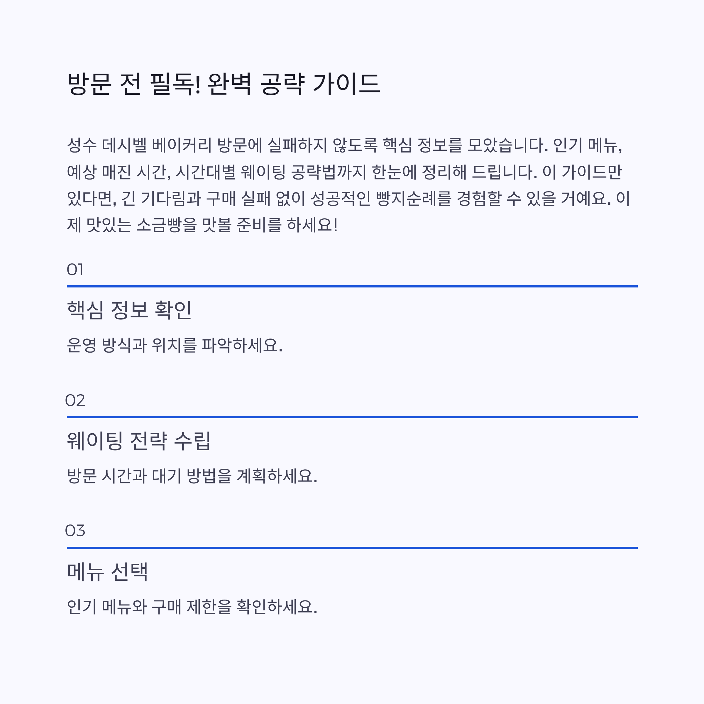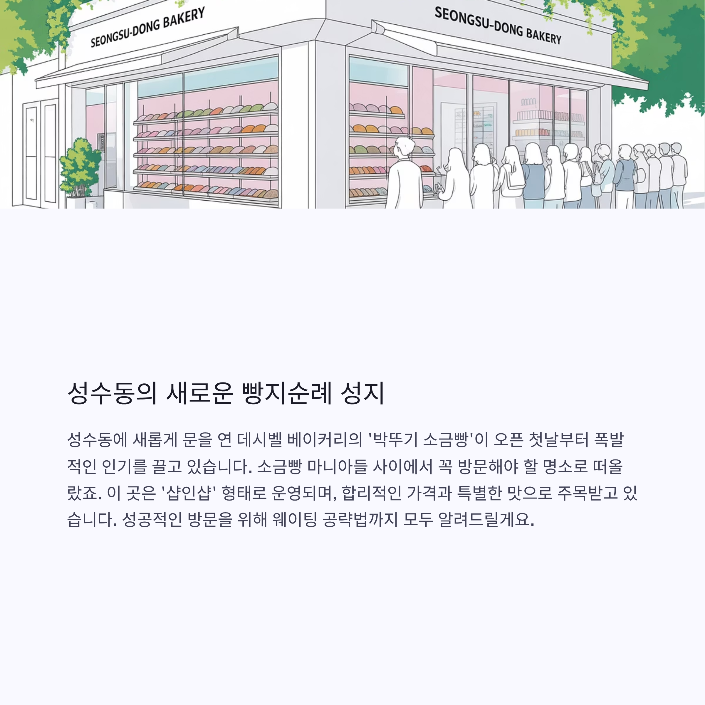 성수동에 오픈한 데시벨 베이커리는 먹방 크리에이터 박뚜기가 선보인 소금빵 전문점으로, 오픈 직후부터 엄청난 인기를 끌고 있습니다. 총 6가지 소금빵을 저렴한 가격에 맛볼 수 있지만, 주말에는 오전 8~9시부터 줄이 시작될 만큼 대기가 길어 인기 메뉴는 2~3시간 만에 매진되고 있습니다. 평일이라도 오전 9시 이전 도착하면 원하는 메뉴 구매 확률이 높아집니다. 인당 3개로 구매 제한이 있으니, 메뉴별 취향 선택도 중요합니다.
