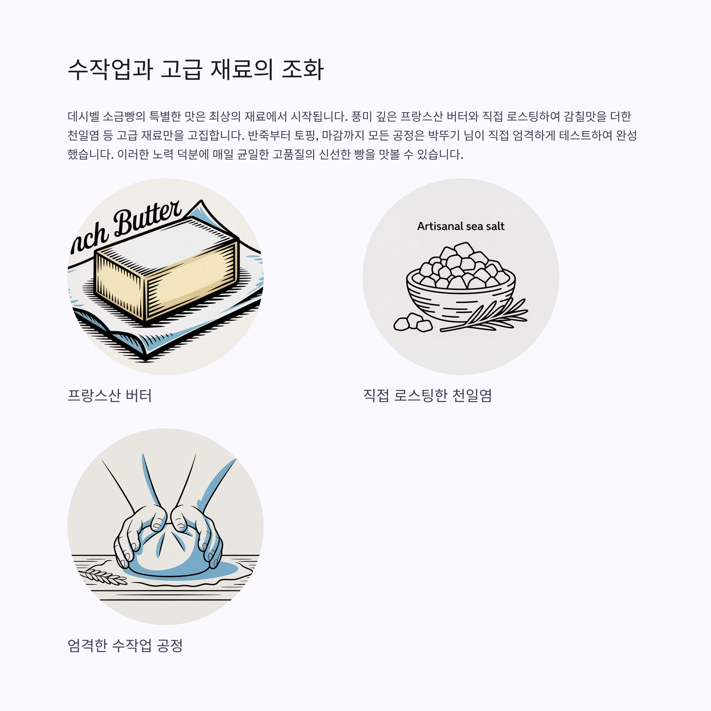 오리지널 소금빵 1,900원, 랜치명란마요 3,600원, 소세지청양마요 3,600원, 크림브륄레 3,900원, 두바이초코 4,900원, 더티초코 3,900원 등 총 6종 모던한 라인업이 준비되어 있습니다. 프랑스산 버터, 천일염 등 고급 재료를 사용하며, 메뉴별로 특색을 살려 제작됩니다.