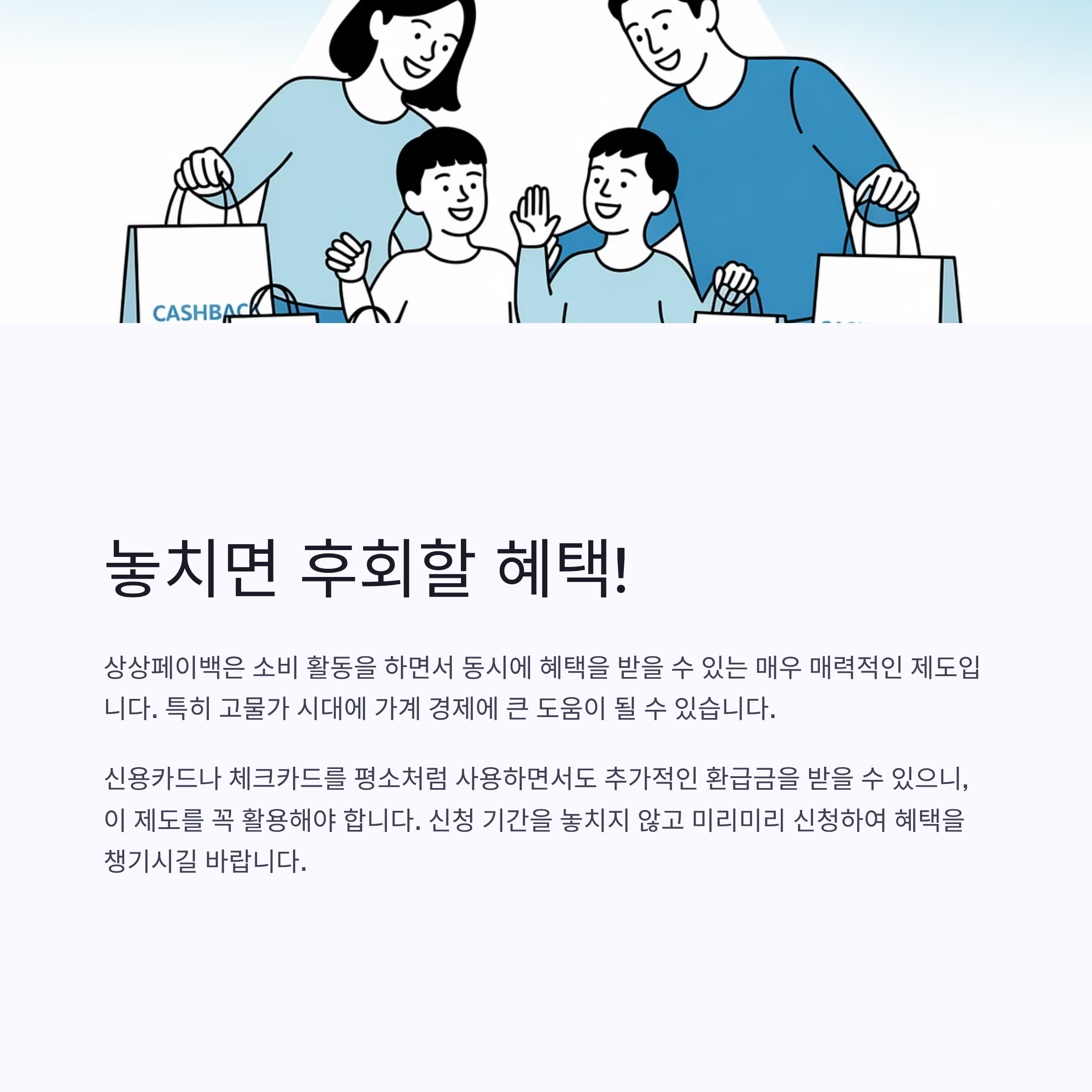 상상페이백은 소비 활동을 하면서 동시에 혜택을 받을 수 있는 매우 매력적인 제도입니다. 특히 고물가 시대에 가계 경제에 큰 도움이 될 수 있습니다. 신용카드나 체크카드를 평소처럼 사용하면서도 추가적인 환급금을 받을 수 있으니, 이 제도를 꼭 활용해야 합니다. 신청 기간을 놓치지 않고, 미리미리 신청하여 혜택을 챙기시길 바랍니다.