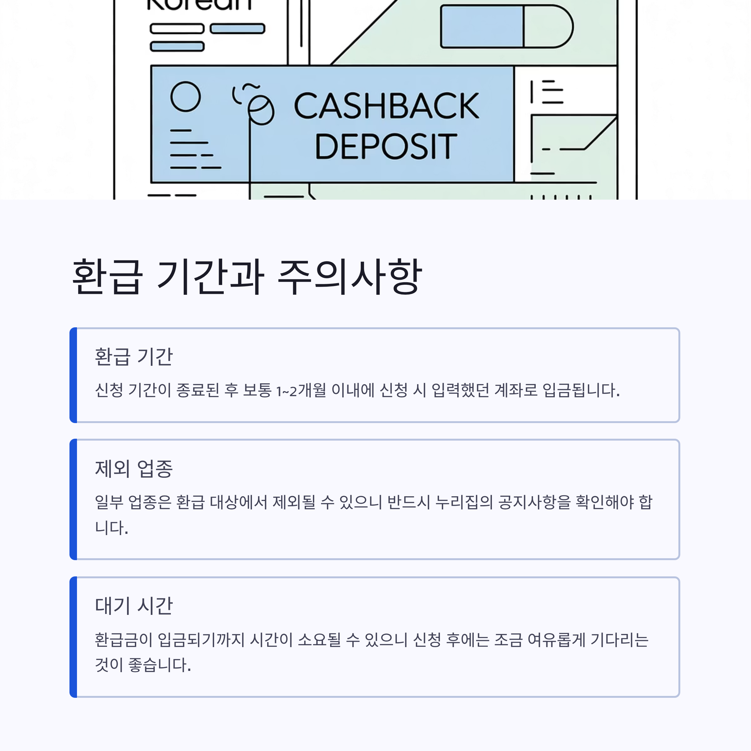 상상페이백의 환급금은 신청 기간이 종료된 후 보통 1~2개월 이내에 신청 시 입력했던 계좌로 입금됩니다. 환급금이 입금되기까지 시간이 소요될 수 있으니, 신청 후에는 조금 여유롭게 기다리는 것이 좋습니다. 또한, 일부 업종은 환급 대상에서 제외될 수 있으니 반드시 누리집의 공지사항을 확인해야 합니다. 예를 들어, 유흥업소나 사행성 업종 등은 제외되는 경우가 많습니다.