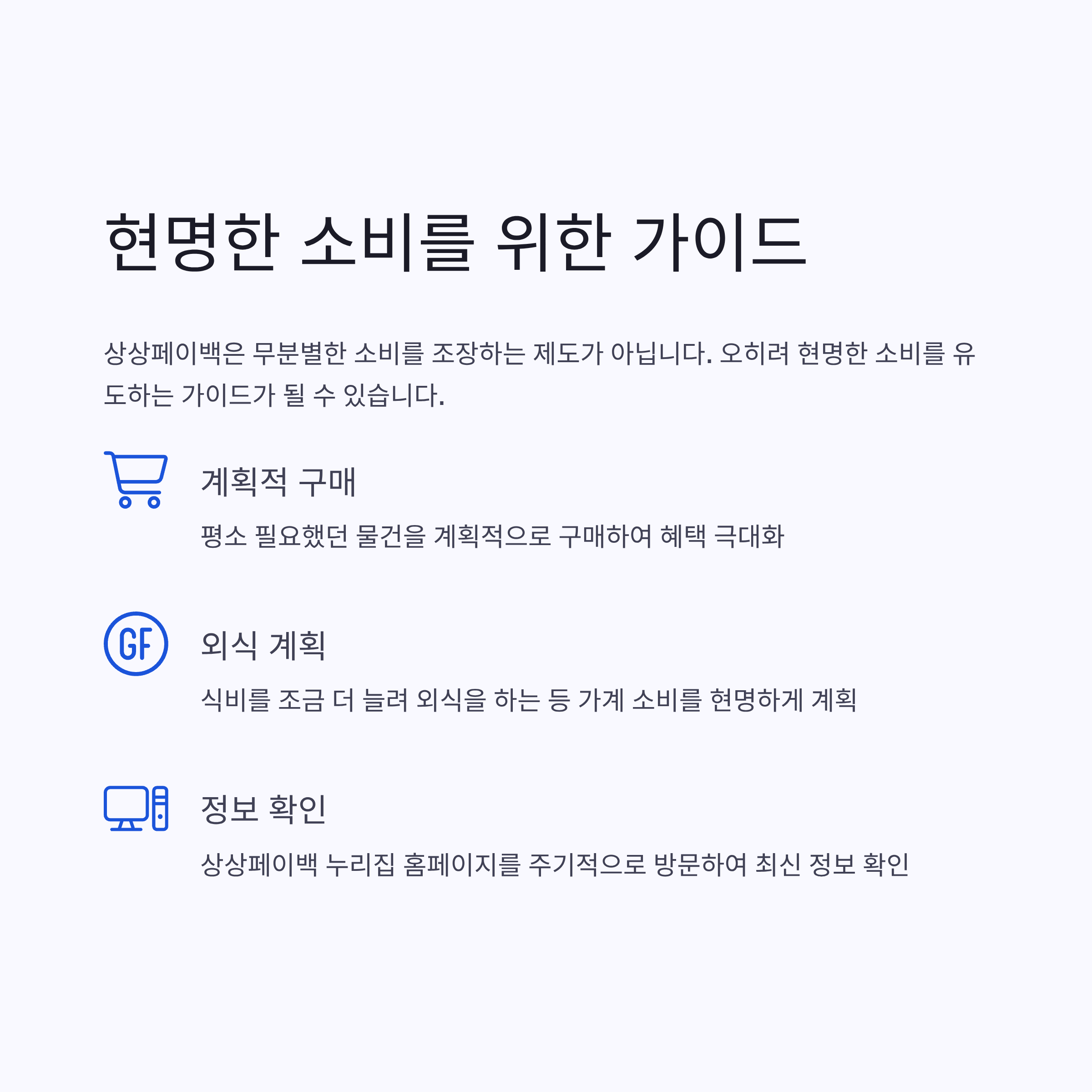 상상페이백은 무분별한 소비를 조장하는 제도가 아닙니다. 오히려 현명한 소비를 유도하는 가이드가 될 수 있습니다. 이 제도를 통해 평소 필요했던 물건을 계획적으로 구매하거나, 식비를 조금 더 늘려 외식을 하는 등 가계 소비를 현명하게 계획할 수 있습니다. 상상페이백 누리집 홈페이지를 주기적으로 방문하여 최신 정보를 확인하고, 나에게 맞는 소비 계획을 세워 최대의 혜택을 누리시길 바랍니다.
