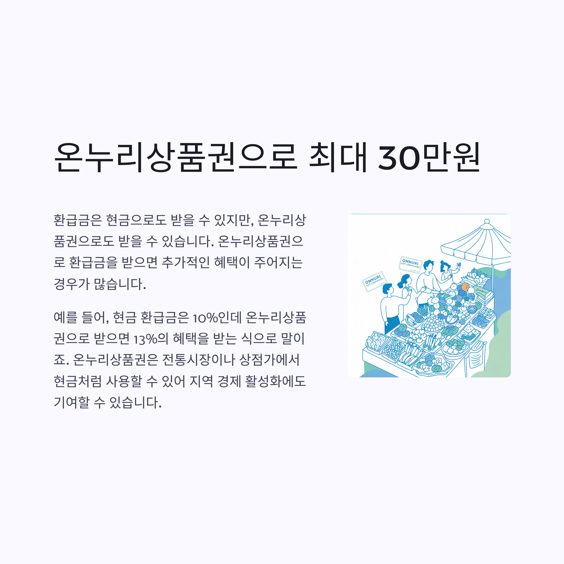 환급금은 현금으로도 받을 수 있지만, 온누리상품권으로도 받을 수 있습니다. 온누리상품권으로 환급금을 받으면 추가적인 혜택이 주어지는 경우가 많습니다. 예를 들어, 현금 환급금은 10%인데 온누리상품권으로 받으면 13%의 혜택을 받는 식으로 말이죠. 온누리상품권은 전통시장이나 상점가에서 현금처럼 사용할 수 있어 지역 경제 활성화에도 기여할 수 있습니다. 환급 방식을 선택할 때 온누리상품권을 고려해보는 것도 좋은 방법입니다.