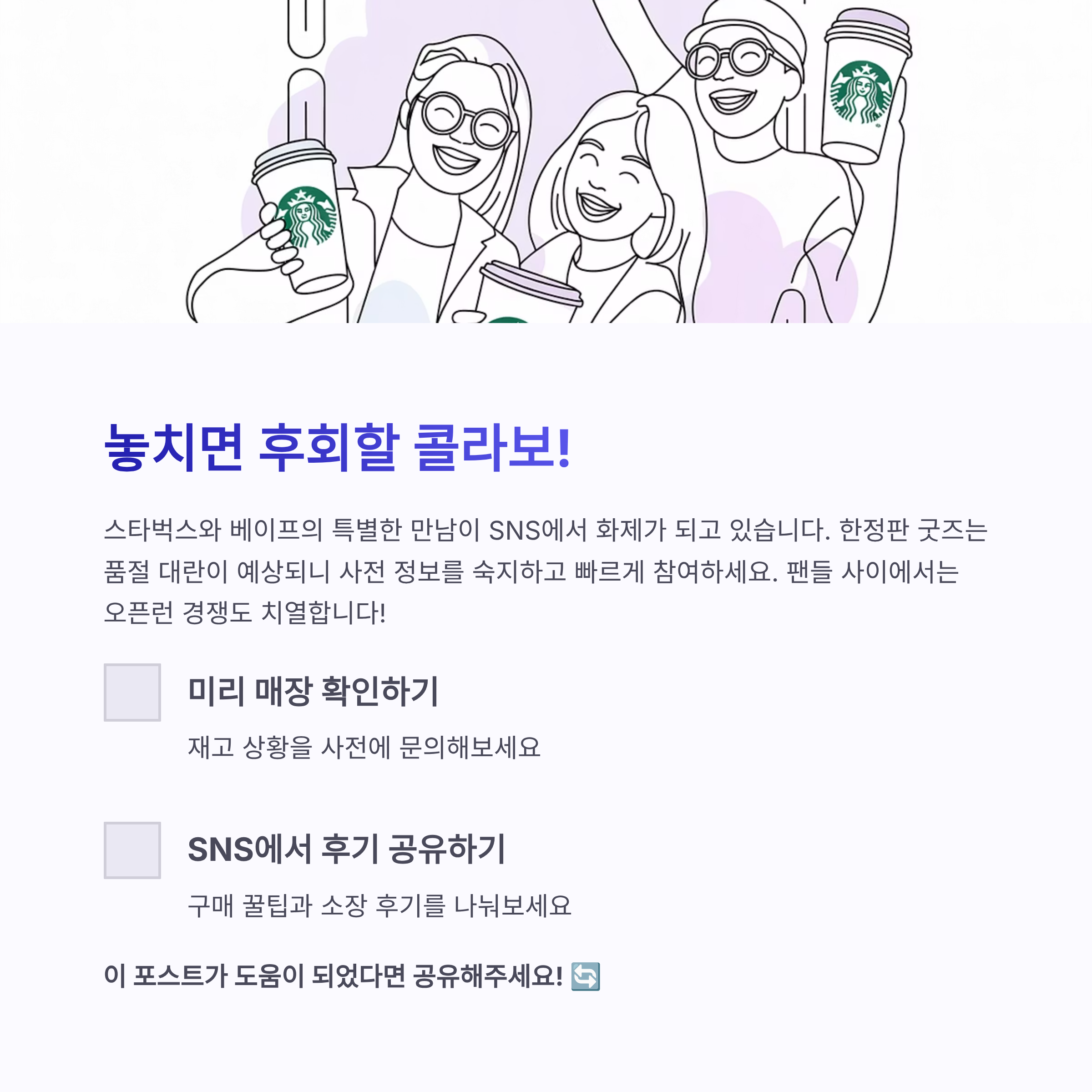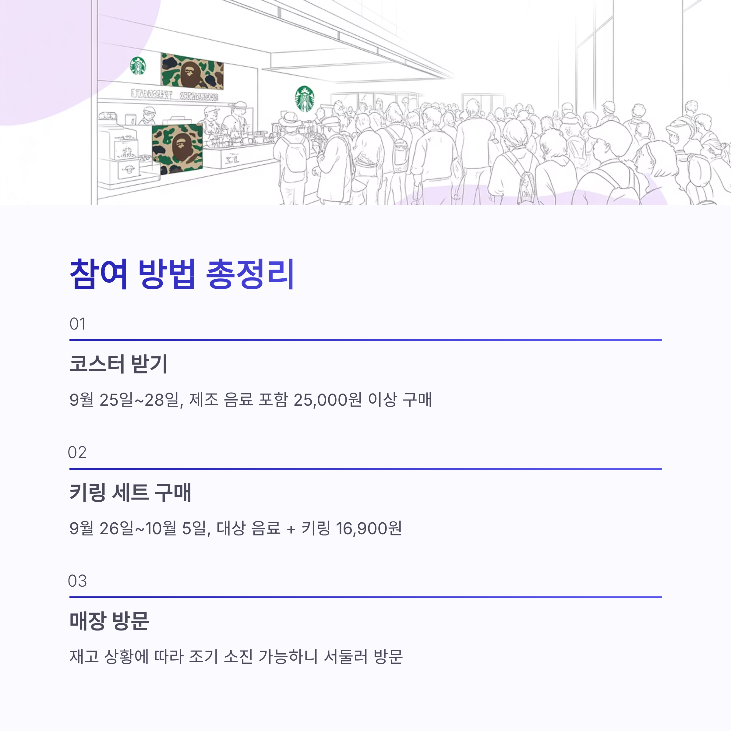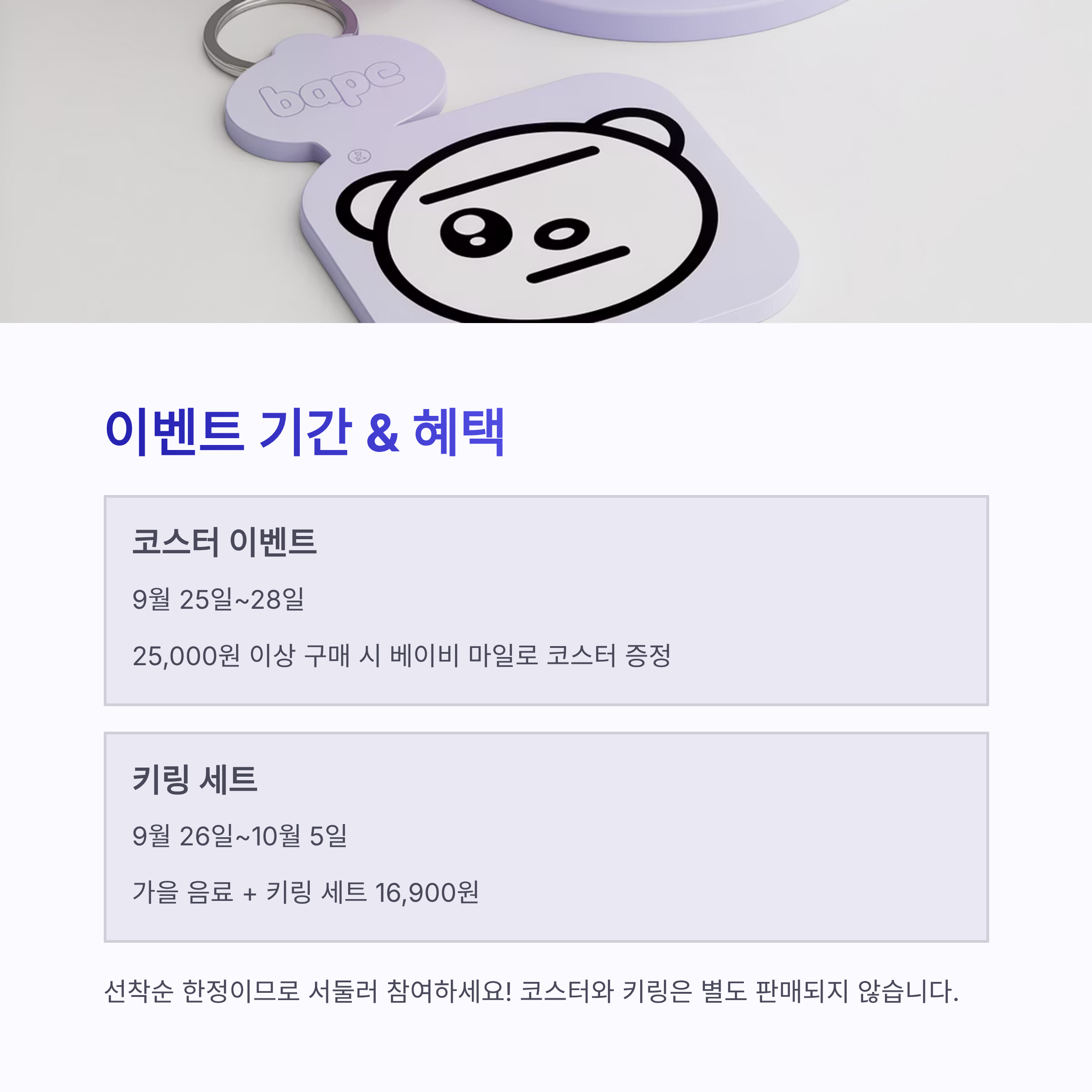 2025년 9월 25일부터 28일까지 스타벅스와 스트리트 패션 브랜드 베이프(BAPE)의 콜라보 프로모션이 진행 중입니다. 음료 포함 25,000원 이상 구매 시 베이비 마일로 캐릭터가 그려진 한정판 코스터를 선착순으로 받을 수 있으며, 코스터는 따로 판매되지 않습니다.