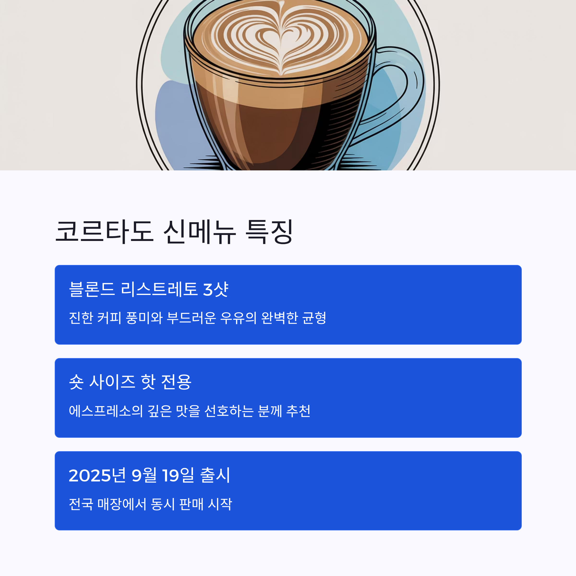 코르타도는 블론드 리스트레토 3샷에 스팀밀크를 더한 음료로, 진한 커피 풍미와 부드러운 우유의 균형이 뛰어납니다. 숏 사이즈 핫 음료로만 제공되며, 에스프레소의 깊은 맛을 선호하는 분에게 추천됩니다. 2025년 9월 19일부터 전국 매장에서 만나볼 수 있습니다.
